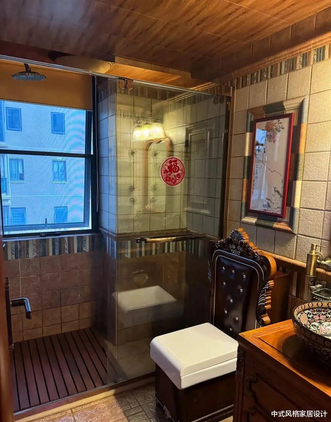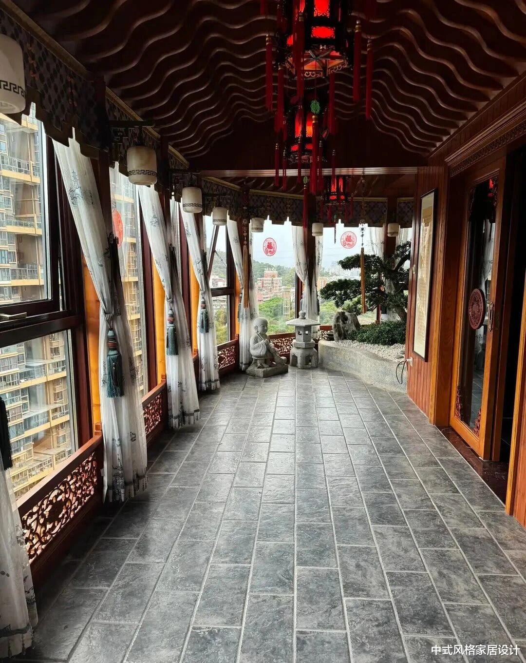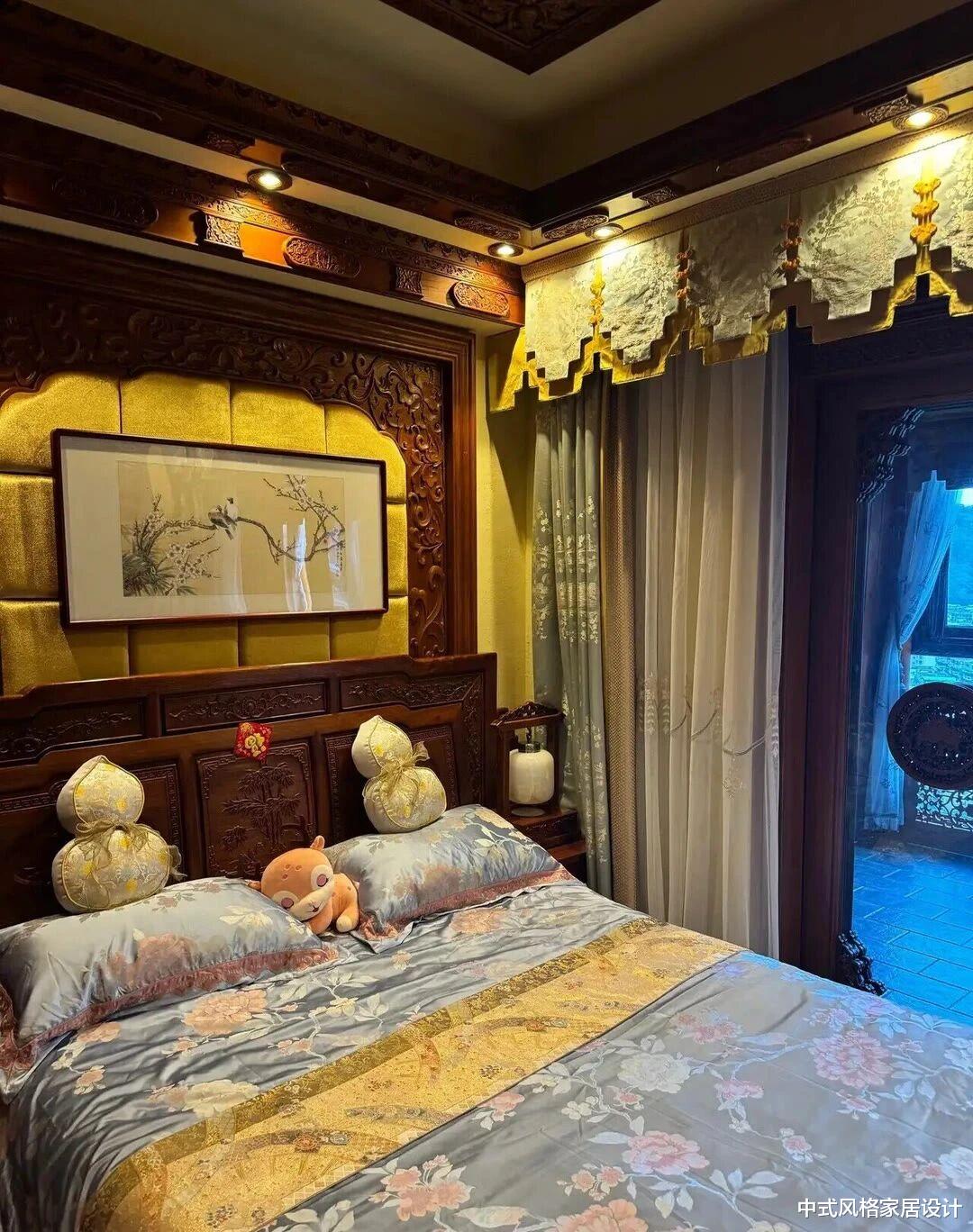 材质之魂:红木的生命力红木不仅是材质,更是这场中式盛宴的灵魂。在这平层空间中,精选的小叶紫檀、交趾黄檀等名贵红木,以各种形态展现着自然的馈赠。地面采用红木拼花工艺,形成回纹边饰与中心团花;墙面则以红木镶嵌玉石、螺钿,构成一幅幅寓意吉祥的图案。最令人惊叹的是那面整墙红木博古架,不仅展示了主人的收藏雅趣,更成为空间中的视觉焦点,其精湛的榫卯结构与细腻的雕刻工艺,令人叹为观止。这些红木家具与装饰,随着岁月流逝,颜色将愈发深沉,纹理愈加清晰,仿佛有了生命,记录着家庭的故事与时光的痕迹。