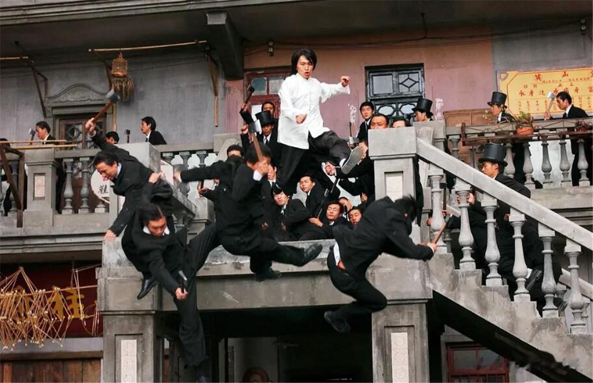 猪笼城寨内,周星驰对阵斧头帮帮众,完全不同于前两场打戏,整场打斗戏份充满了“高科技”元素,周星驰将大量帮众扔上天,接着他们像雨点般落下的桥段,能瞬间让观众想到《黑客帝国》。