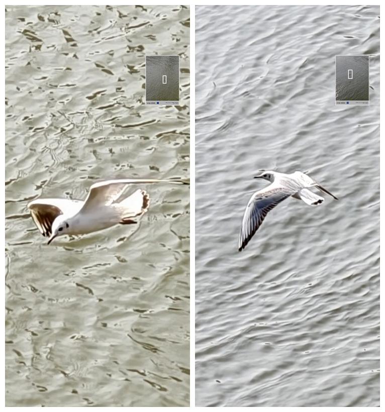 红嘴鸥在江面飞行时速度较高,虽然距离较远,拍到的红嘴鸥较小,但放大后可以看到它们的身形、翅膀和尾翼的羽毛和它又尖又长的喙。