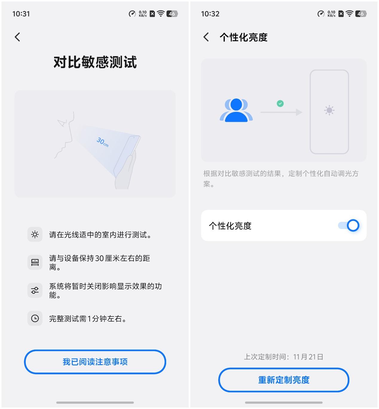 我个人比较喜欢个性化亮度这个功能,在做了对比敏感度测试后,会给出一份专属的个性化自动调光方案,亮度调节会更符合自己的观感,这相当于是定制专属于自己的亮度调节方案。