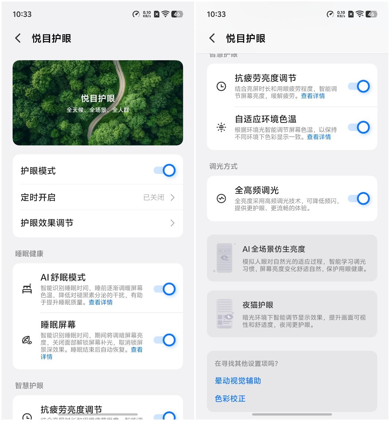 X300在护眼这块做得比较细致,除了常规的护眼模式外,还有AI舒眠模式、睡眠屏幕、抗疲劳亮度调节、自适应环境色温以及硬件调光方式的全高频调光切换按钮。针对喜欢坐车看手机的用户也有晕动辅助,支持行车时显示或始终显示,系统还会自动学习用户对不同应用的手动调节习惯,然后做出智能调节应用亮度的操作。