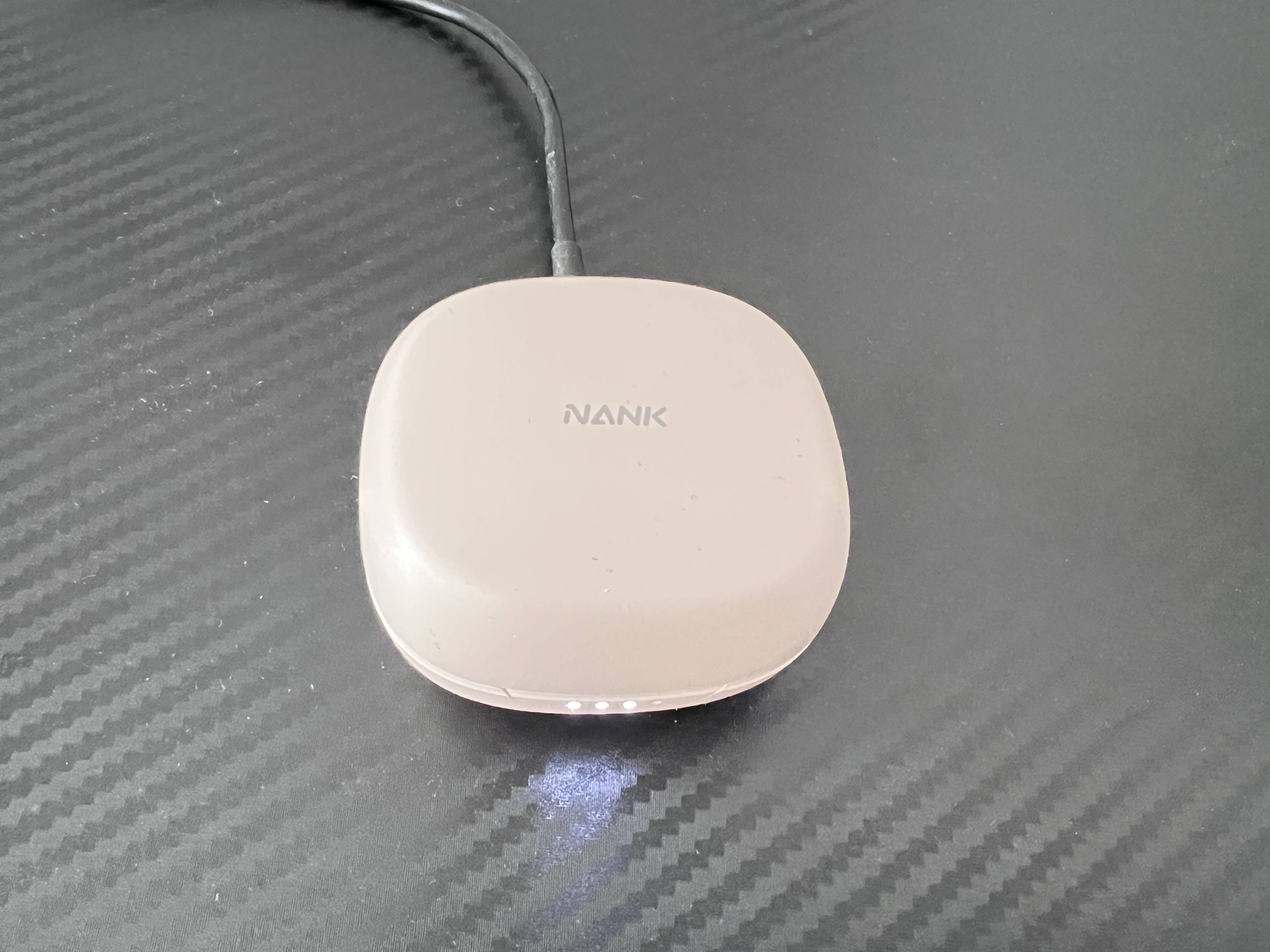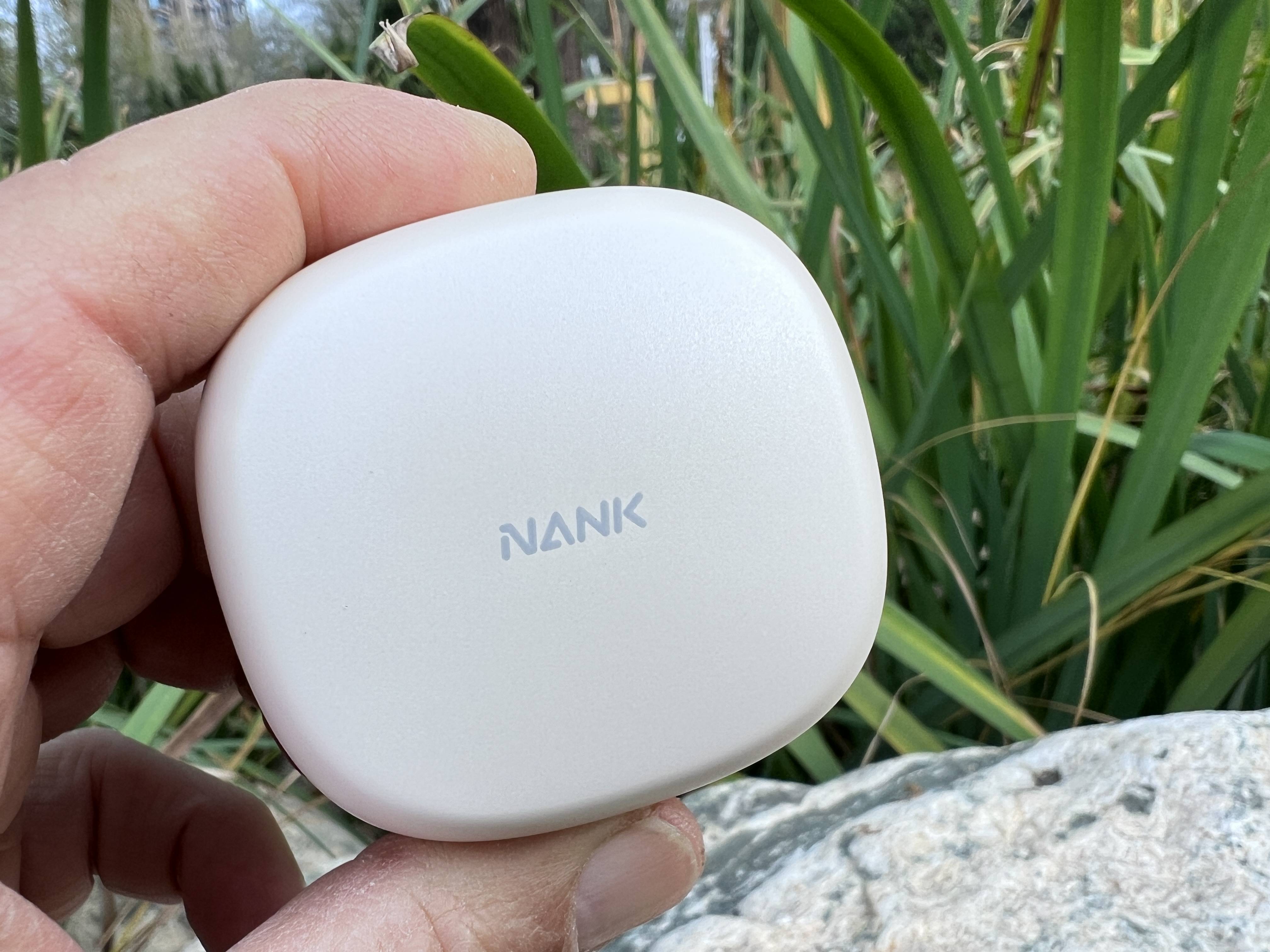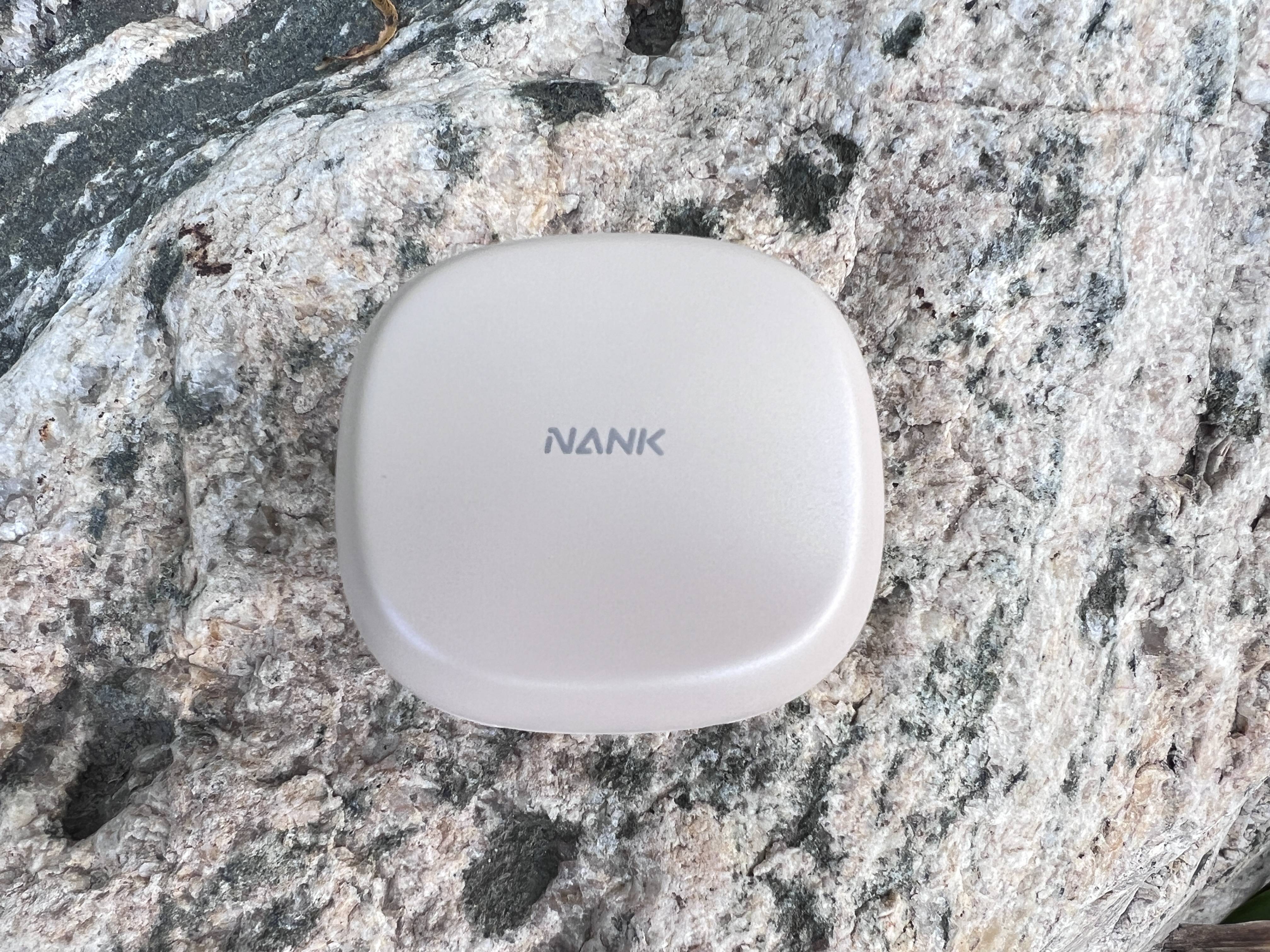 其充电仓形状为方形鹅卵石造型,颜值不错,手感好。充电仓表面采用钢琴烤漆工艺,很有质感。中部印有有南卡的 logo。