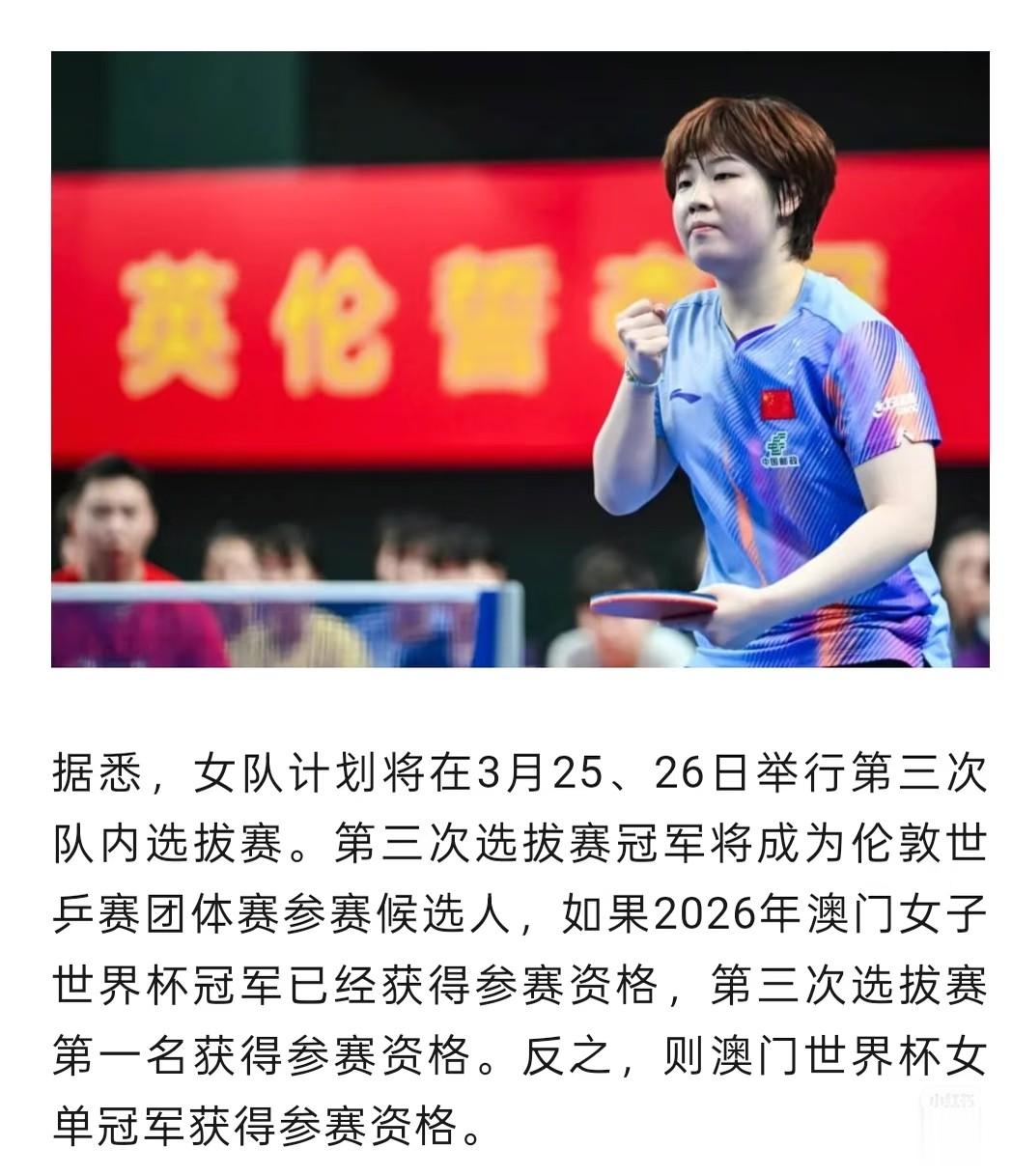 那么国乒女队现在就是确认四人(孙颖莎、王曼昱、陈幸同、蒯曼)参加伦敦世乒赛,还差最后一人,据悉,国乒女队计划将在3月25、26日举行第三次队内选拔赛。第三次选拔赛冠军将成为伦敦世乒赛团体赛参赛候选人,如果2026年澳门女子世界杯冠军已经获得参赛资格,则第三次选拔赛第一名获得参赛资格。反之,则澳门世界杯女单冠军获得参赛资格。