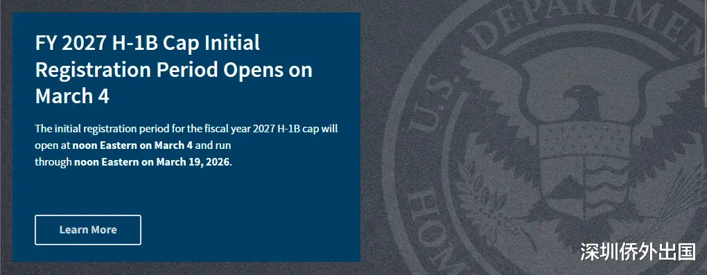 2027财年H-1B电子注册将于美国东部时间2026年3月4日中午12:00正式开放,并于美国东部时间2026年3月19日中午12:00截止。