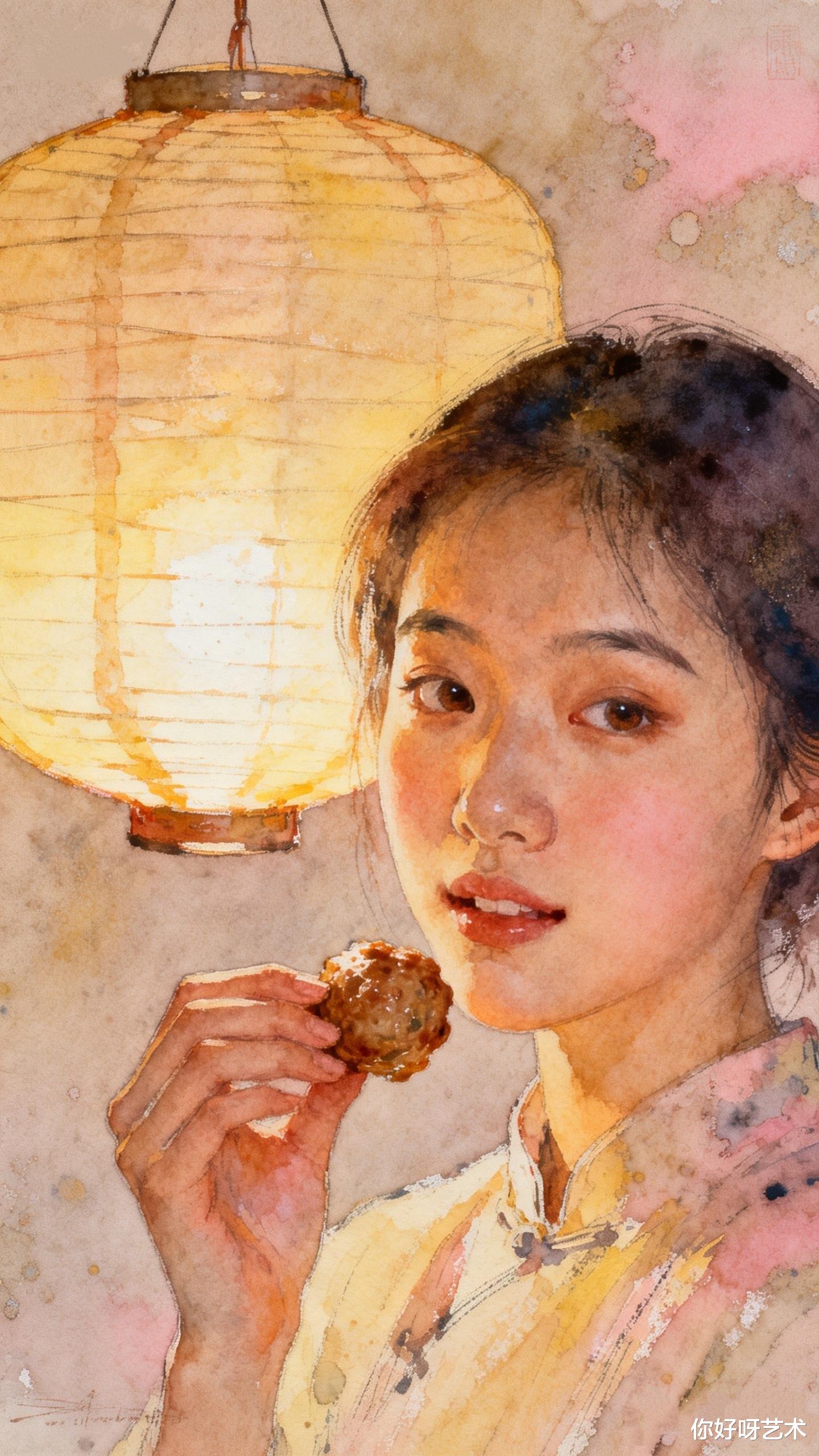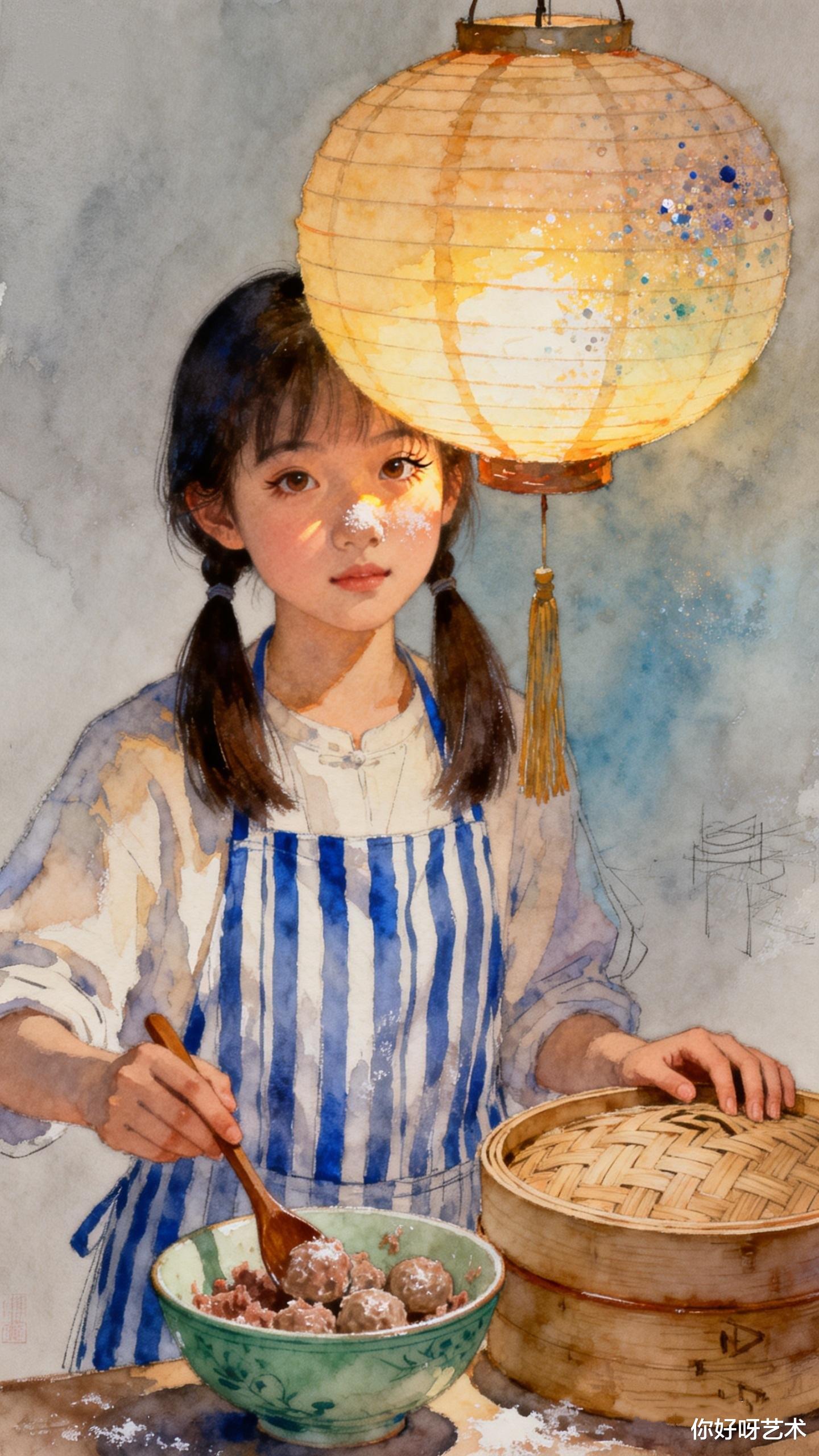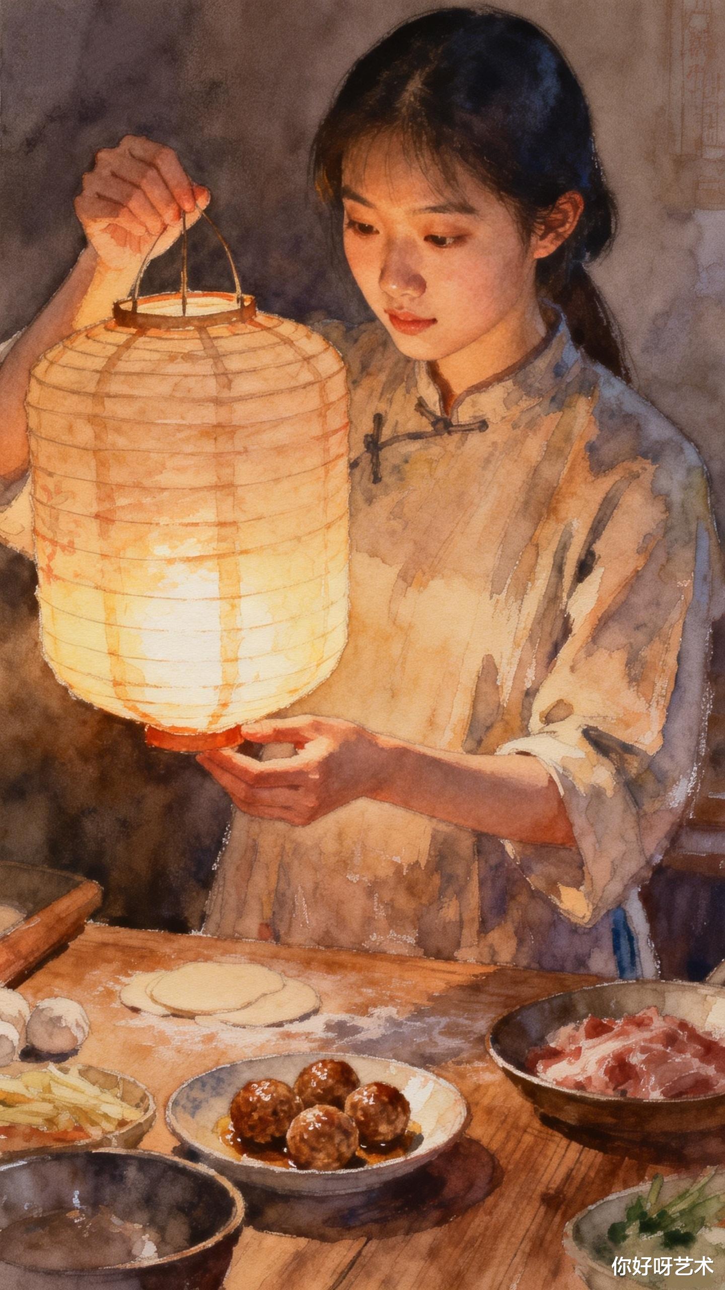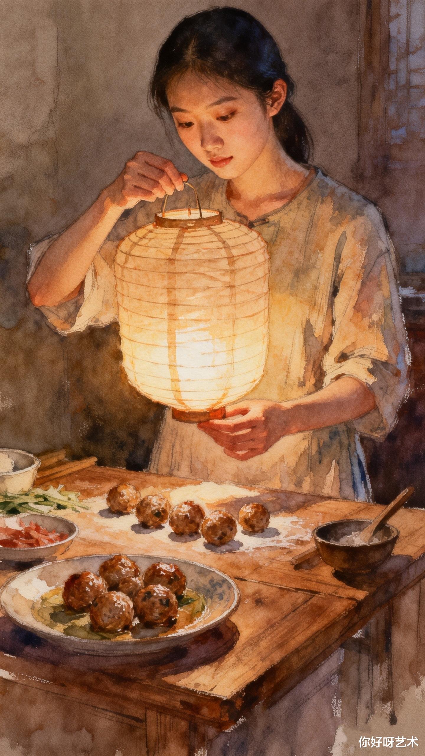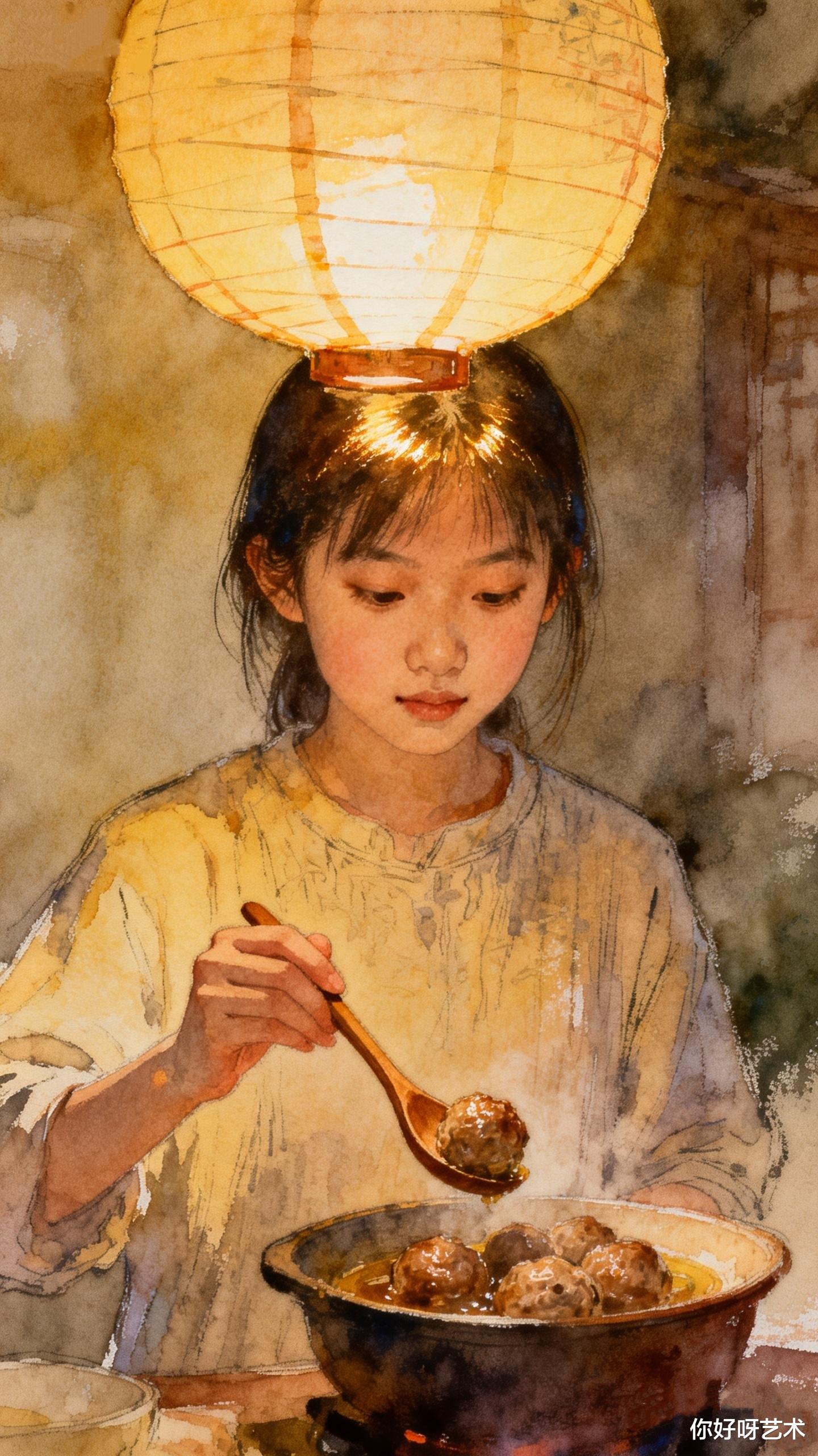 这雨水时节的初二,本就藏着春的温柔与年的暖,四喜丸子是新年餐桌的吉庆,更是家人团圆的象征,四颗丸子一碗汤,喜临门、福满堂、寿安康、运道昌,每一颗都揉着心意,每一口都藏着团圆。水彩的清润最懂这份人间美好,将灶火的暖、丸子的金、汤羹的浓、少女的柔,还有窗外雨丝的浅青,揉成一幅温软的画,没有浓墨重彩,只有烟火里的踏实,团圆里的甜暖。