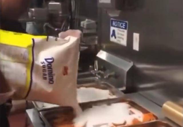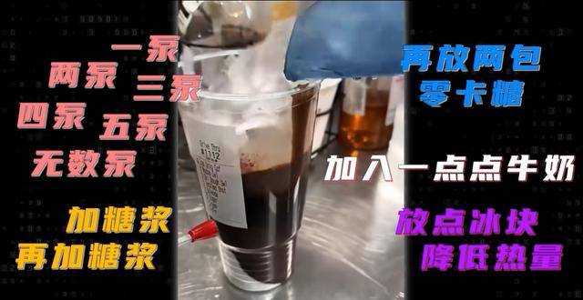 美国一杯咖啡的配方:先加三分之一的白糖打底,按压不知具体几泵的摩卡巧克力酱,再加入糖浆,接着再加糖浆,然后放入两包不明成分的零卡糖,加入少量牛奶,搅拌成暗沉的形态,最后加入冰块等其他原料,以降低热量。