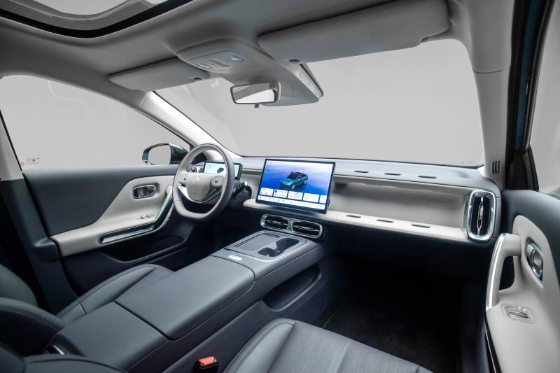 在车内,零跑B01的内饰能够让人眼前一亮,整体视觉效果不错,采用简约科技风格的设计,大面积软性材质覆盖搭配精致缝线工艺,提升了整体质感。8.8英寸全液晶仪表与14.6英寸中控屏恰到好处,配合简洁的中控UI设计,操作直观流畅。方向盘的样式同样吸睛,和传统的按键功能方向盘不同,零跑B01采用全新的触控式滚轮设计,操作更具科技感与便捷性。