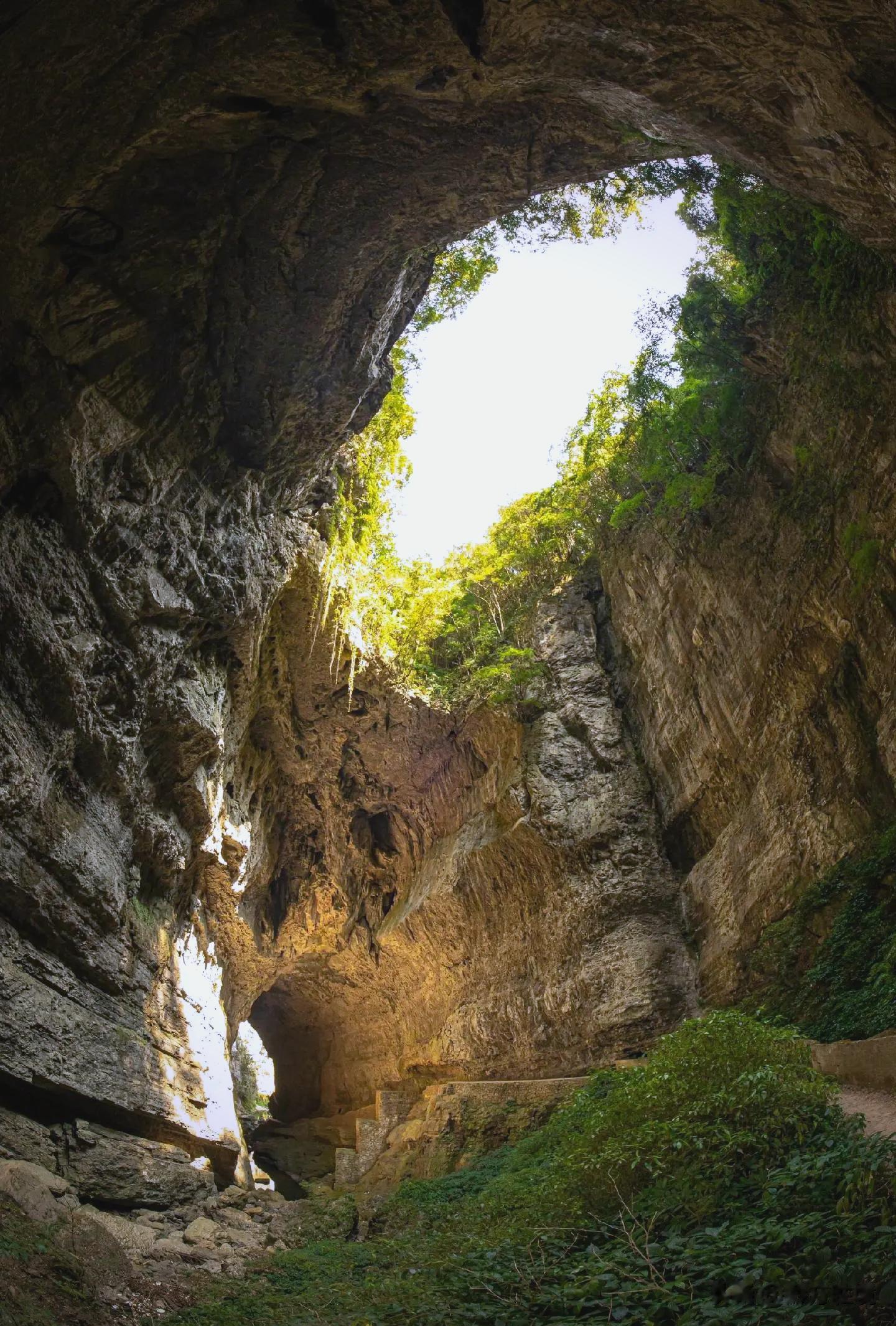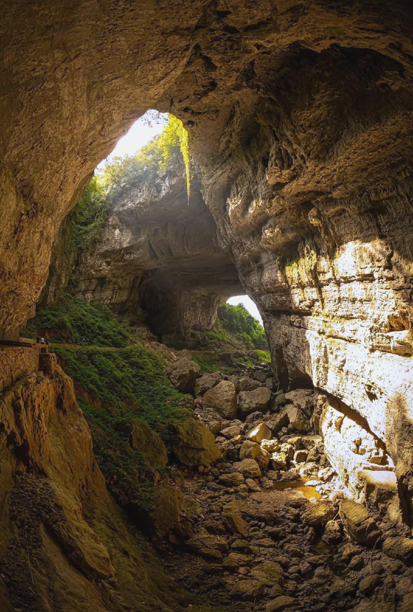 二洞位于修文县六屯镇大木村,与开阳县禾丰乡交界处,是香火岩景区上游核心节点,紧邻玉门关峡谷起点,官方归属于香火岩峡谷风景区的二洞天生桥景点。这里有巨型喀斯特穿洞,也叫做天生桥,由一大一小双洞组成。主洞跨度约 40 米、高约 50 米,晴天正午至午后能形成清晰的丁达尔光;双洞总长度数百米,连接上游暗河与下游玉门关峡谷溪流。洞内保留早期小型发电站遗址,兼具自然探险与小众人文看点。