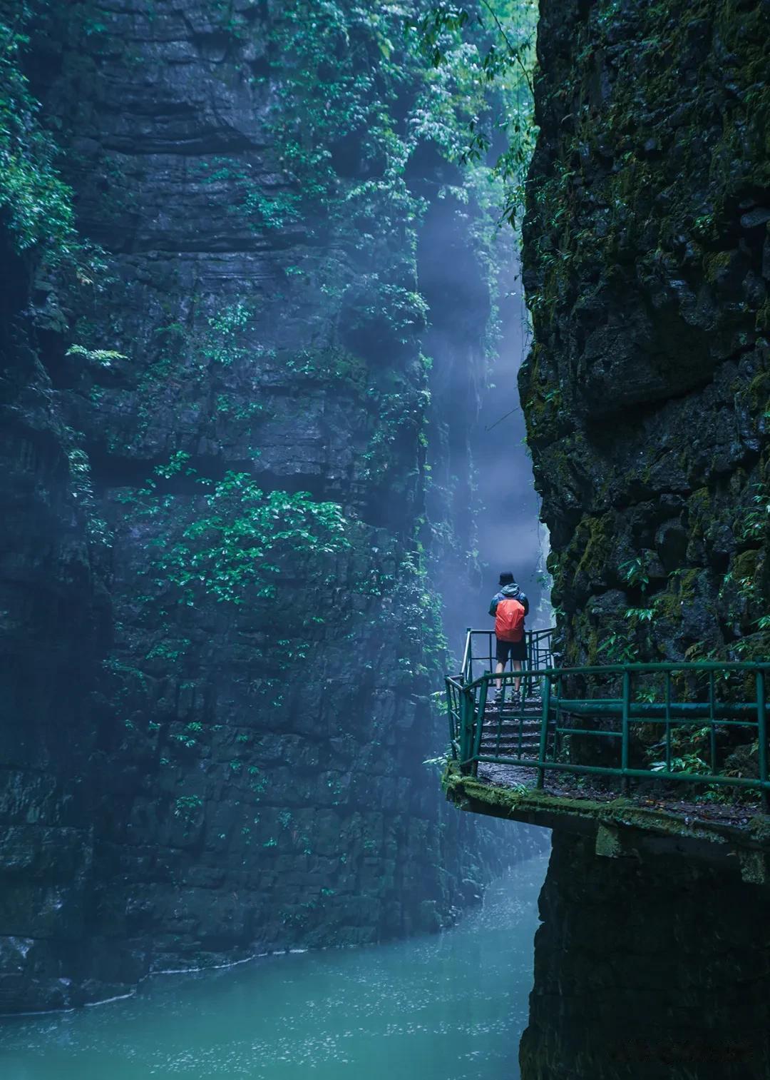 玉门关峡谷,是香火岩峡谷的中间段,大概3公里,下游连接了金鸡湖和瀑布群,上游到达了修文二洞天生桥和吐云洞,两岸崖壁对峙,形成了“一线天”的景象。峡谷中的绝壁上修建了石阶栈道,脚下溪水潺潺,头顶仅露狭长天光,穿行时山风穿林,水声不绝。