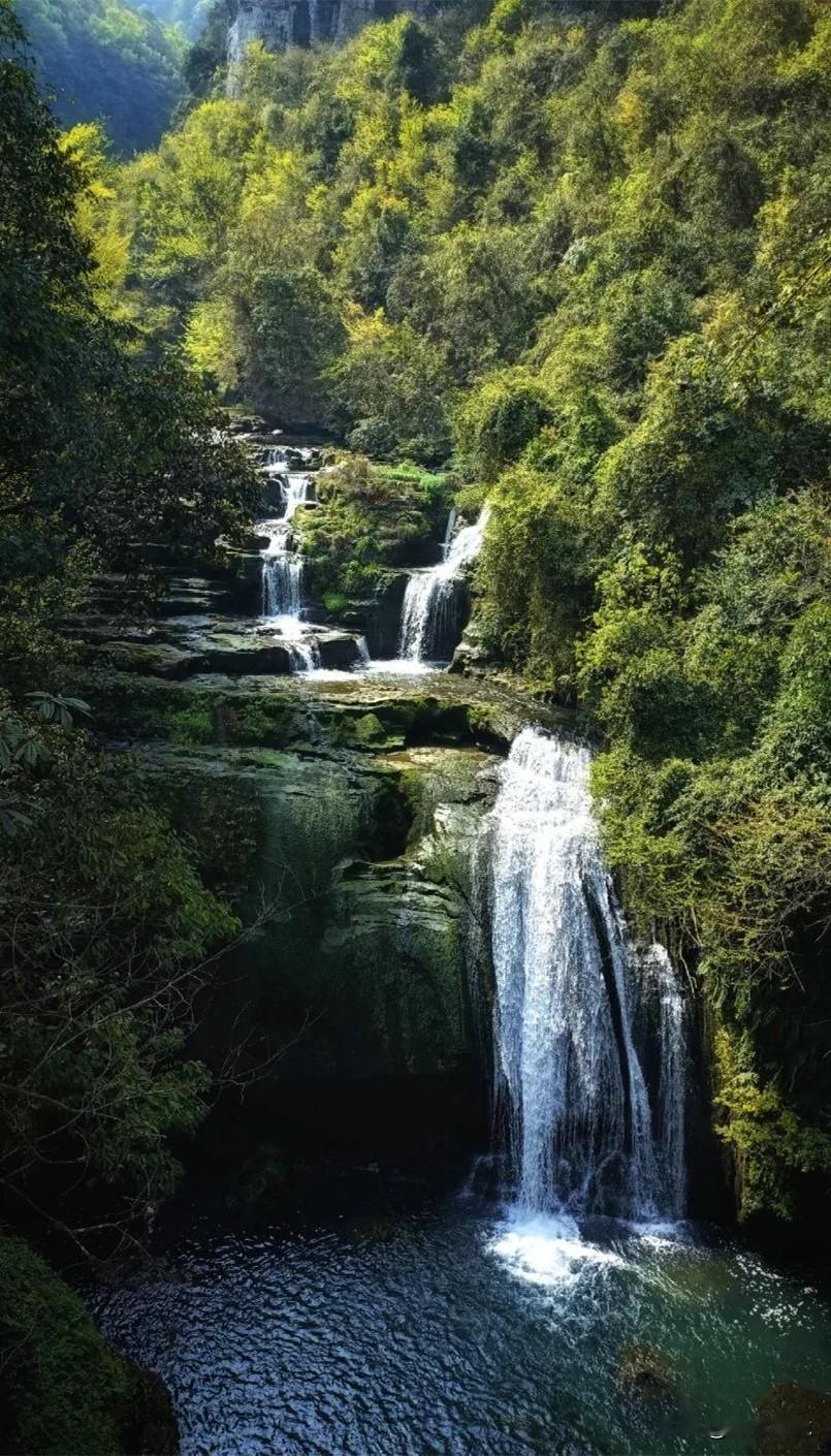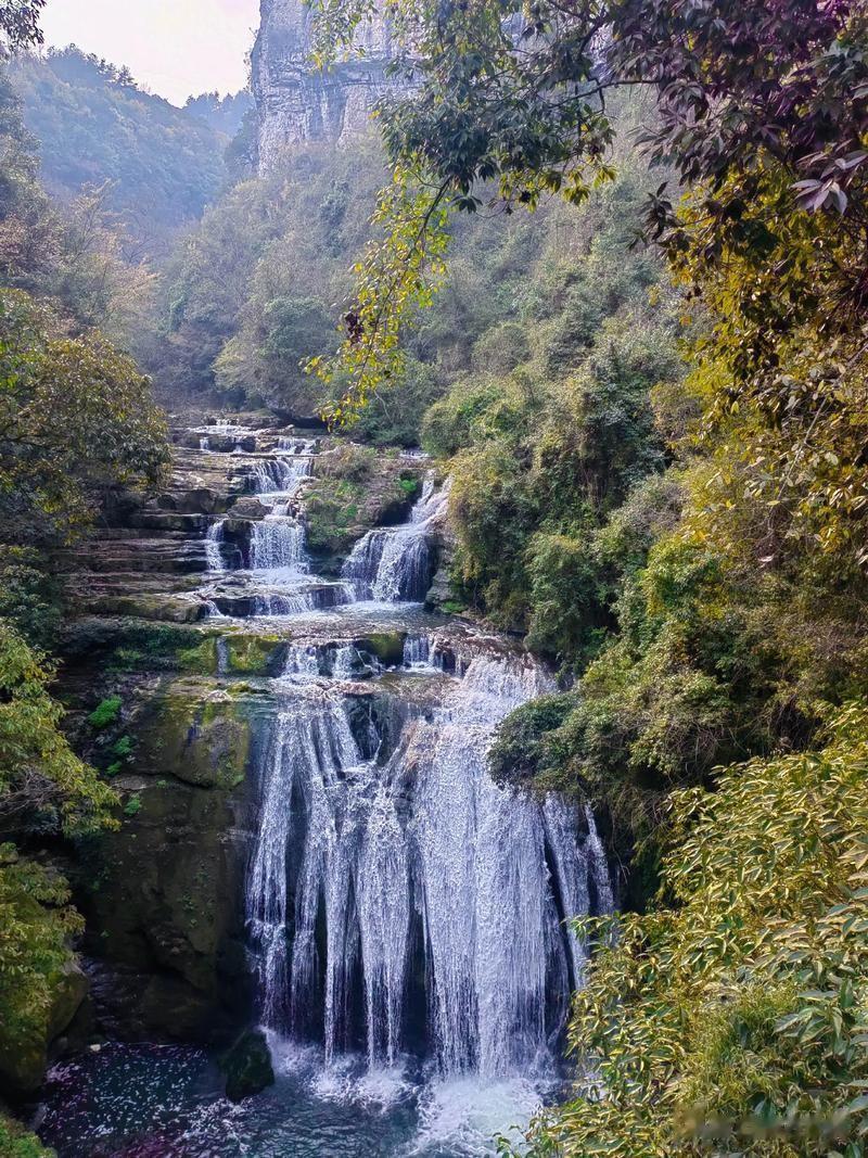 沿金鸡湖浮桥、山崖栈道往峡谷深处走,便遇见串联成景的五级瀑布。最高一级约 15 米、宽 30 米,总落差 60 余米,是典型的叠水瀑布。水流不似主瀑那般猛烈,而是逐级跳跃、层层跌落:时而如轻纱漫卷,贴着青黑的岩石缓缓淌下;时而如碎玉迸溅,在嶙峋的礁石间撞出万千银珠;时而又汇集成一股急流,冲向下一级水潭,激起团团白雾。瀑布后方的天然佛龛(香火岩神龛) 宽约 500 米、高约 100 米,石纹勾勒出坐佛轮廓,水雾缭绕时,仿佛香火袅袅,这也是 “香火岩” 名字的由来。