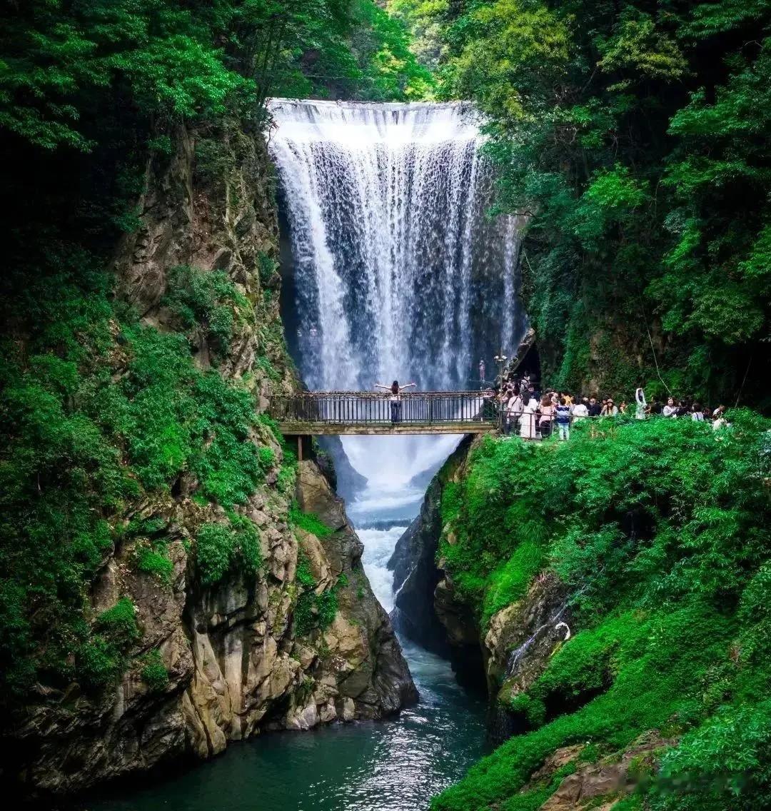 金鸡湖如一块翡翠嵌在喀斯特峡谷间,湖水由拦河坝漫出,便骤然化为凌空飞泻的白练。丰水季,水流如千军万马奔涌过坝顶,宽数十米的水幕轰然砸向崖下深潭,雷声般的轰鸣在峡谷间回荡不绝;水雾蒸腾向上翻卷,阳光斜照时,一道七彩长虹常悬于水雾之中,伸手可及似的。站在观瀑桥或瀑布内侧的岩洞口回望,水幕如巨大的银帘垂落,将青绿的山、碧蓝的天切割成两半;水珠噼啪打在衣上,带来透心的清凉。看到此情此景,让人想起李白的诗句“两水夹明镜,双桥落彩虹”。
