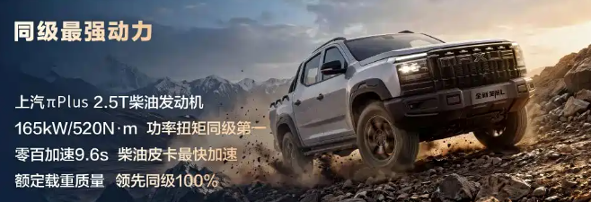 然而,皮卡的灵魂永远在“三大件”,而这也是上汽大通星际L真正吸引人的地方。整车搭载上汽πPlus 2.5T柴油发动机,参数相当亮眼,最大功率140kW,峰值扭矩高达520N·m。这是一个什么概念?作为对比,主流2.0T汽油发动机的扭矩通常在320-380N·m之间,而星际L的扭矩直接突破了500N·m,匹配博格华纳提供的分时四驱系统,在4L低速四驱模式下最大扭矩可放大2.64倍,这意味着轮端扭矩瞬间可超过1300N·m,面对复杂的越野路况环境,其越野通过性有较高的保障。