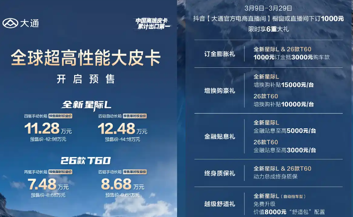 在皮卡市场逐渐“乘用化”的浪潮下,越来越多的年轻人开始将目光投向这个曾经被视为纯粹“工具车”的细分领域。能装、能跑,还能偶尔撒野的皮卡,似乎成了继硬派越野之后的新晋“大玩具”。今日,上汽大通MAXUS全新星际L正式开启预售,限时权益价下探至11.28万元起。这一价格策略无疑在圈内投下了一枚重磅炸弹,意味着现在我们可以用购买紧凑型SUV的价格,买到一台拥有强悍低扭和分时四驱的中型皮卡。但话说回来,这真的划算吗?