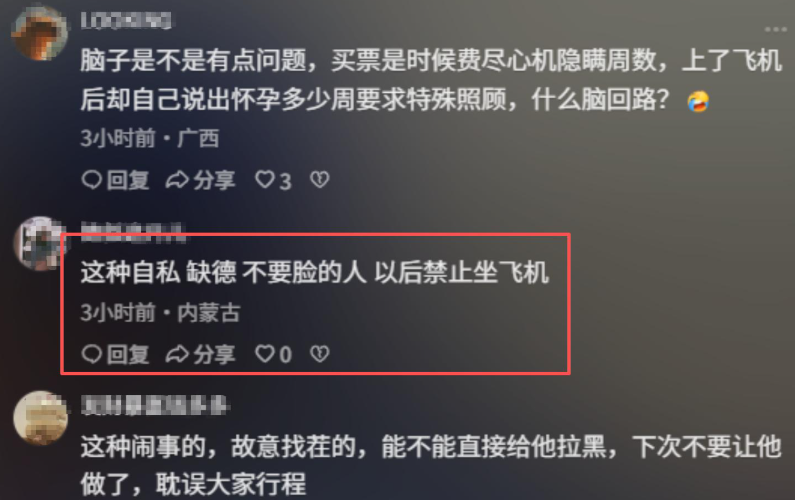 民航业内人士也科普:“孕晚期禁止登机不是歧视,而是基于无数案例总结的安全规则,飞机上医疗条件有限,一旦出现紧急情况,很难及时救治”。大家普遍认为,孕妇的行为不仅无视自身安全,更漠视一飞机乘客的时间和权益,这种 “规则是给别人定的” 心态,实在让人不齿 。