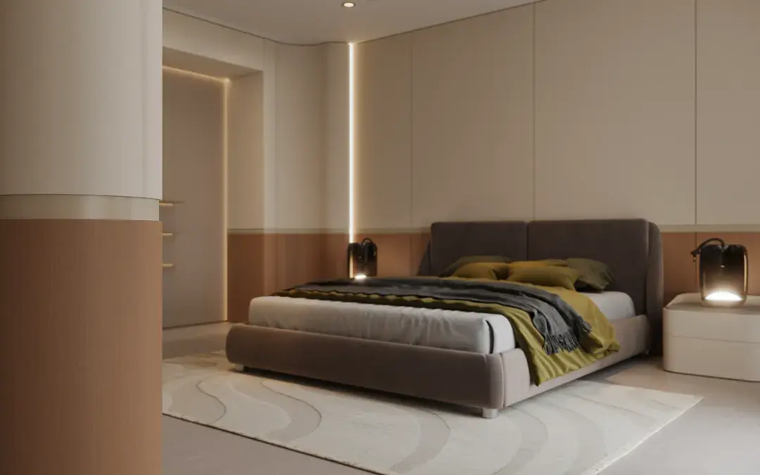 卧室的中心是一张宽敞的大床,床上铺着灰色与棕色相间的床单,既显得稳重又不失活力。无主灯的设计让卧室的照明更加柔和而富有层次,灯带散发出的温暖光芒,能驱散所有的疲惫与烦恼。在这样的环境中,无论是回味游戏中的精彩瞬间,还是沉浸在自己的小世界里,都能感受到一种前所未有的宁静与幸福。