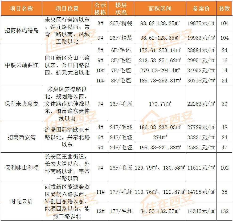 本批次价格公示的中铁云岫曲江、招商西安湾、保利未央璞悦、招商林屿缦岛,加推房源均为改善房源。
