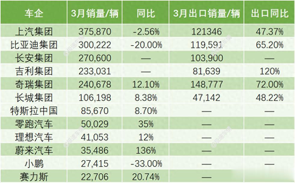 大家好,这里是极速车情。今天为大家带来3月份中国车企销量详情。