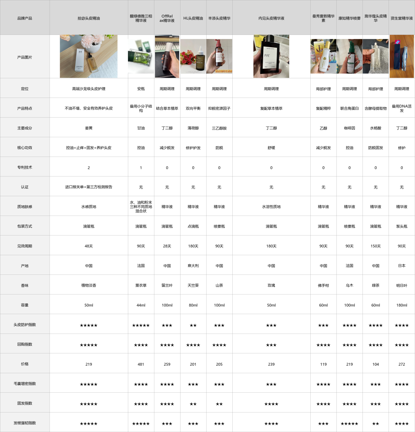 为了让大家快速看清这10款头皮精油的核心差异,我整理了一份实测参数对比表,所有数据都是这1个月我自己实测出来的,不掺假、不虚标,重点看质地、控油时长、吸收速度、成分安全性这些关键指标,帮大家快速初步筛选。