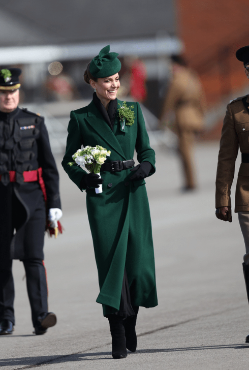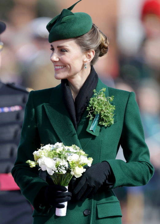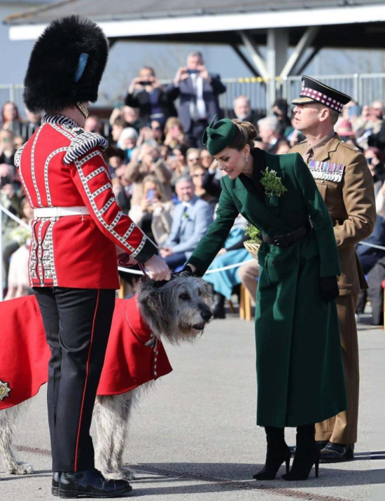 3月17日,威尔士王妃凯特以爱尔兰卫队上校的身份出席在奥尔德肖特镇的蒙斯军营举行的圣帕特里克节游行活动,让人没想到的是她全身没有一个单品是新款,依然穿出了“准王后”的气势!