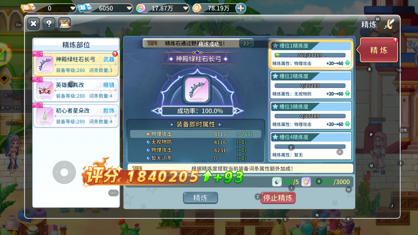 加成幅度:精炼属性有着一定的加成范围,如物理攻击的加成范围是 +20 - +60 ,随着精炼度的提升,属性加成会逐渐靠近上限。当槽位 1 精炼度达到 769/13289 时,物理攻击增加了 769 ,装备的即时属性也随之大幅提升。