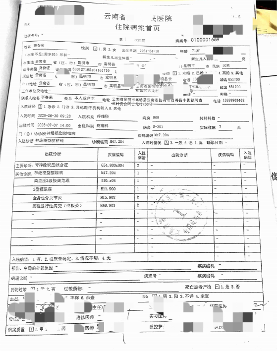 2025 年 6 月 30 日,他在家人陪伴下到云南省某三甲医院就诊,因年龄较大,不能对腰部进行手术,收入疼痛科治疗,但无好转。该院入院记录显示:“腰及双下肢疼痛伴麻木 50年,近 3 年加重,疼痛 VAS 评分最高 8 分,弯腰、行走时加剧,休息仅缓解至 5 分,伴间歇性跛行、双下肢肌力下降(左 4 级、右 3 级)”。检查还发现,他患有腰椎退行性病变(终板炎)、脊神经嵌压综合征、神经根型腰椎病,并发高血压 2 级极高危组、2 型糖尿病、全身性骨关节炎,身体濒临 “崩溃”。