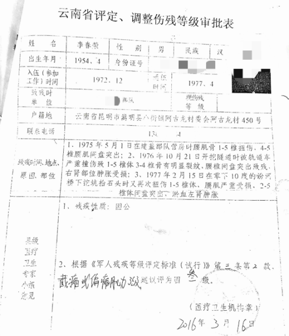 1977 年 4 月李春荣退伍时,部队开具负伤证明,但受限于当时医疗条件,伤势未愈。回乡务农后,伤痛恶化:1994 年腰椎骨折手术留下弯腰受限后遗症;从1994年起,肾囊肿、左肾受伤严重,1976年部队医院医生建议肾移植,至今左肾囊肿较大疼痛,让身体更虚弱,腰疼痛发作频繁。2018 年,经云南省远程可视医学诊疗中心多学科现场会诊报告单,该患者目前(左下肢阳性),症状腰部两次受伤有一定关系,证明评残是左下肢,并不是腰部。依据《军人残疾等级评定标准》第八条第 2 款,他被评定的是腿部,因公八级伤残。彼时他以为伤痛有了 “名分”,却未料后续残情远超八级伤残范畴。