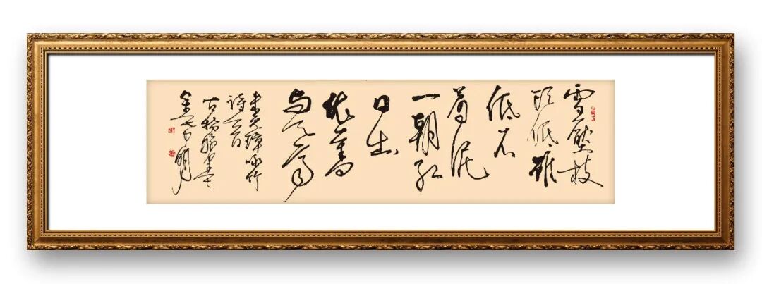 笔墨是书法艺术的灵魂,善用笔者方能成就佳作。金希明先生的草书,最动人之处便在于其娴熟精湛的笔墨技法,笔力劲健,用墨灵动,心手互师,浑然天成。他曾说:“善用笔者如顺水行船,须臾可过万重山;不善用笔者如浅摊划船,运不得一桨。”这份对用笔的深刻理解,贯穿其整个创作生涯。