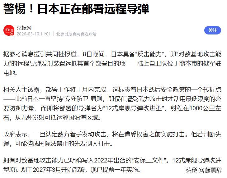 日本的远程导弹这批军事装备原定于2027年3月方才列装,眼下却硬生生将时间表往前挪了整整一年。