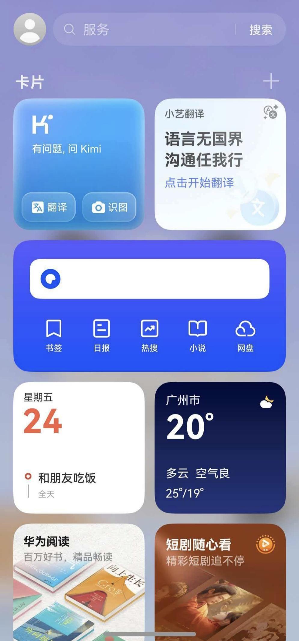 华为负一屏还是我的“生活小管家”,我把天气卡片和AI工具卡片放在这里。睁眼手机桌面右滑负一屏就能看天气,决定今天要不要开窗通风,晒被子。更贴心的是AI工具卡片,我特意把Kimi、夸克和小艺翻译卡片搁一起 —— 一些AI助手更擅长做特定的事情、效率更高、质量更好。想查健身动作,夸克卡片点进去直接搜“宅家普拉提教程”,不用跳转多个页面。纠结中午吃什么,Kimi卡片里输入“简单易做的一人食”,几秒钟就出好几份食谱。偶尔想跟着视频学两句外语,小艺翻译卡片可比词典好用多了。这些卡片无论是宅家办公,学习还是做饭都能搭把手,效率直接up。