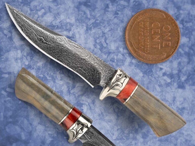 罗伯特的微型战术刀就是一个例子,一把极小的战术刀,细节毫不含糊——虽然它并不比一枚一便是的硬币大。总长仅为2.875英寸,具有1.6875英寸的大马士革刀片(192层1084-15N20)。出彩的是它还有一个猛犸象牙手柄,一个爱丽丝·卡特手工雕刻的护手。
