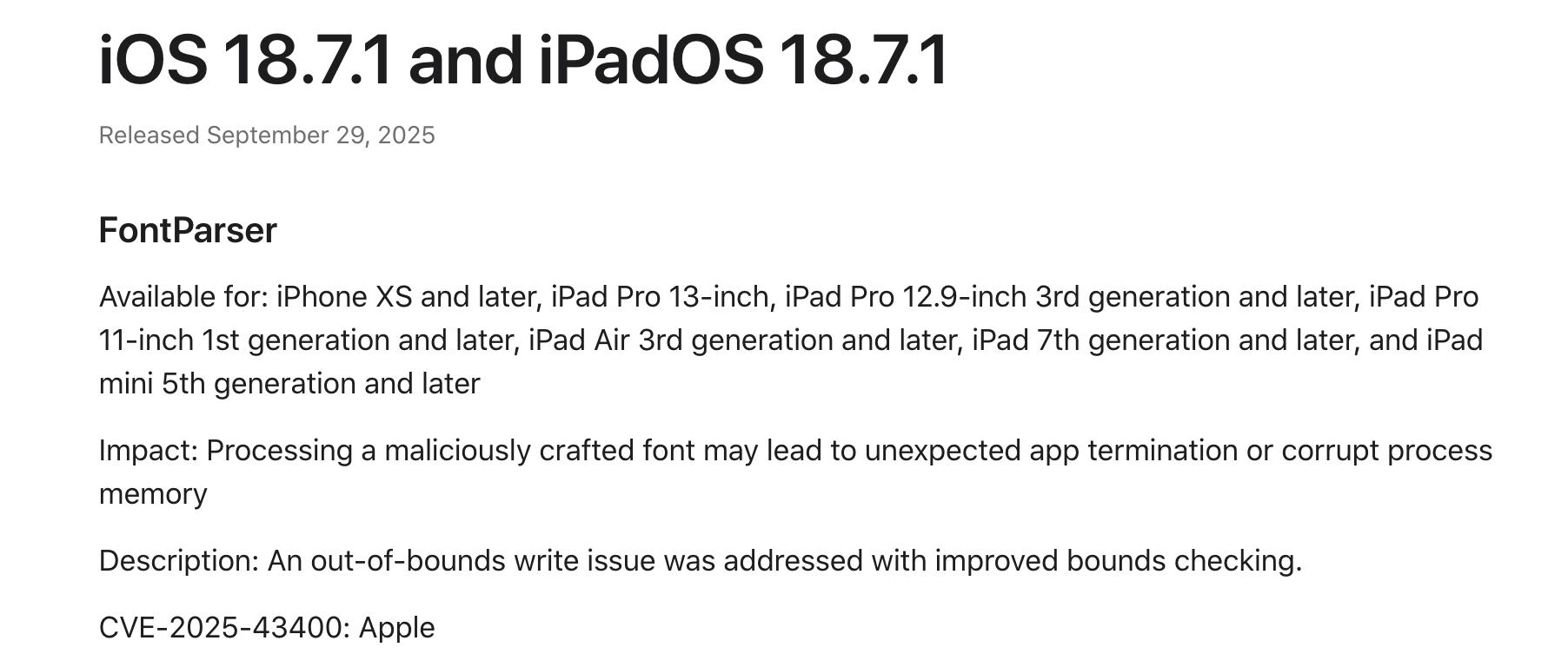 iOS 18.7.1 修复的安全漏洞和 iOS 26.0.1 相同,处理恶意构造的字体文件可能导致应用意外终止,或破坏进程内存。