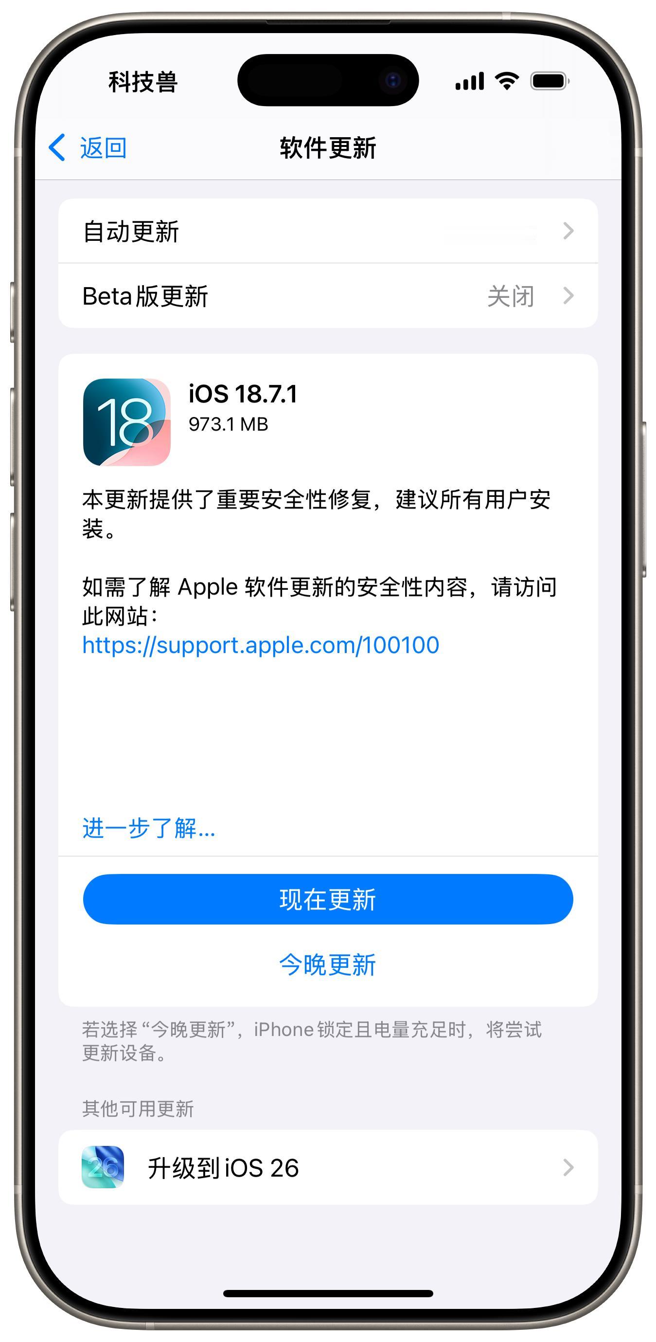 今天(9 月 30 日)凌晨,苹果除了发布 iOS 26.0.1 外,还向停留在 iOS 18 系统的 iPhone 推出了 iOS/iPadOS 18.7.1 小版本更新。本次更新并未引入新的功能或显著变化,主要对系统安全性进行了修复。