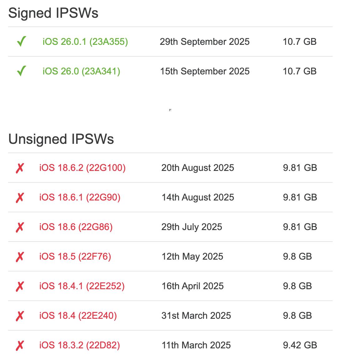 需要注意的是,iOS 18.7.1 更新仅提供 OTA 方式,没有完整的刷机系统包。这意味着我们无法通过电脑刷机从 iOS 26 降级到 iOS 18.7.1。