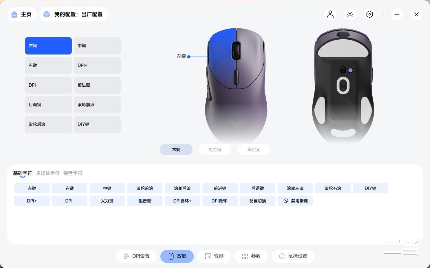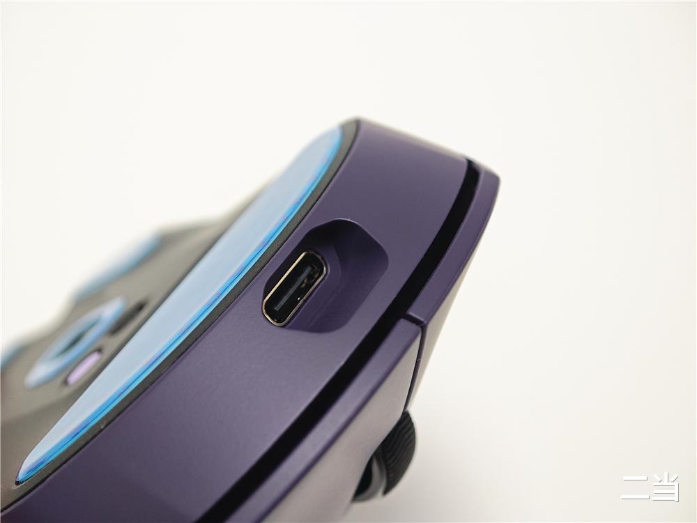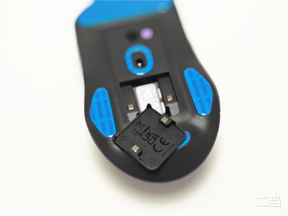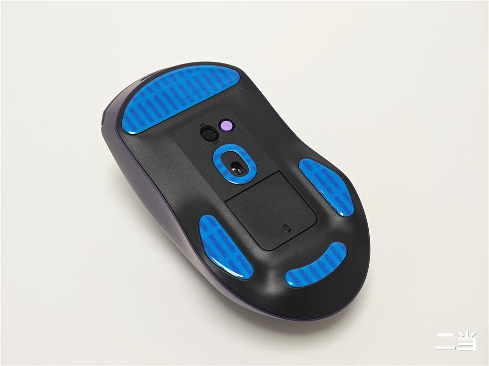 鼠标底部设有紫色DIY按键(出厂默认回报率可调)、开关和磁吸附件仓盖。底部贴有三段式氟龙脚贴,各方向滑动和微操作时顺滑无顿挫,鼠标还支持玻璃追踪技术,即使在玻璃桌面上也能稳定工作。