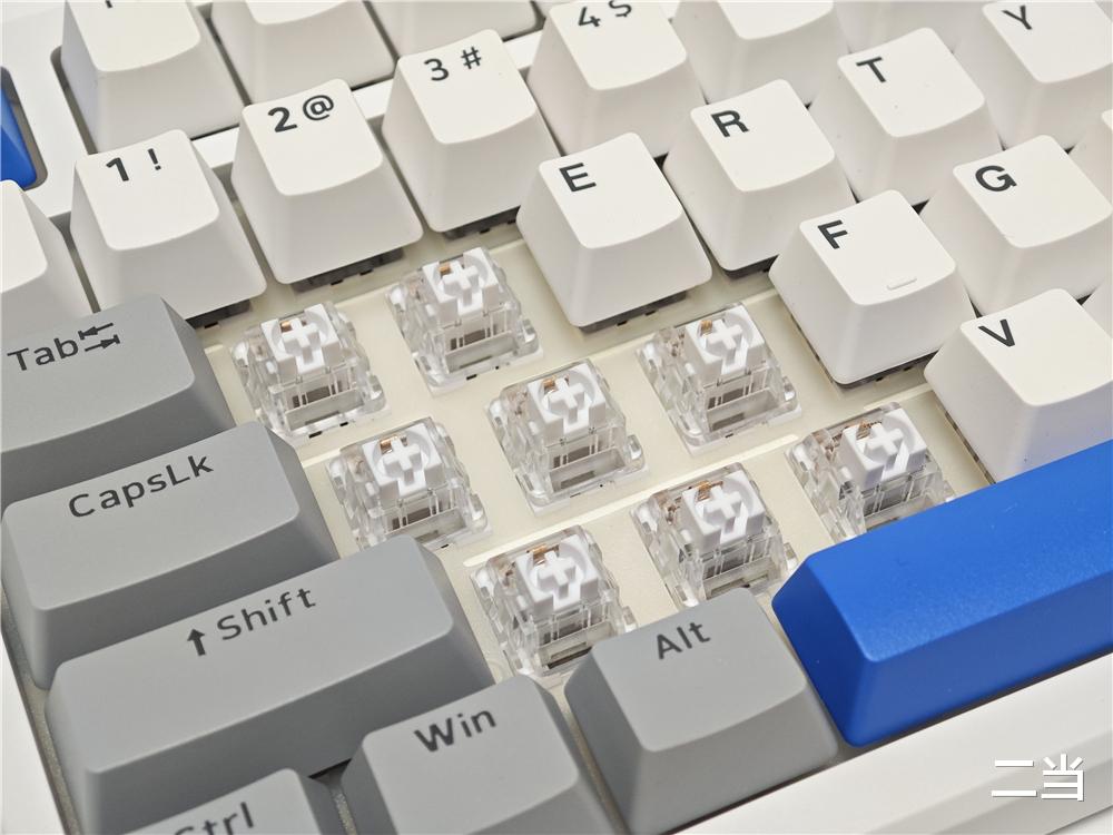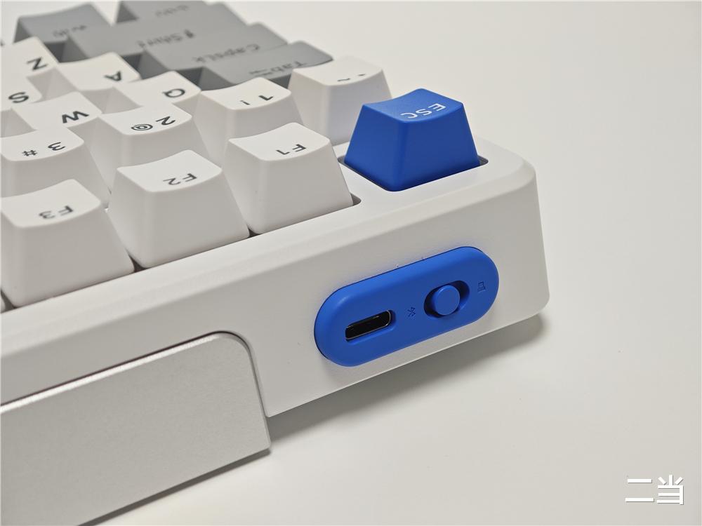键盘顶部边框左侧预留Type-C充电接口和模式切换键,支持蓝牙5.0、无线2.4GHz和有线三种模式连接,轻拨模式切换键,最高支持5台设备之间切换,有线连接时还支持边用边充。