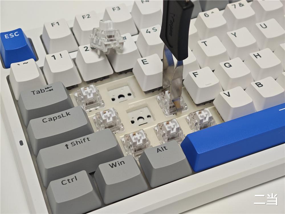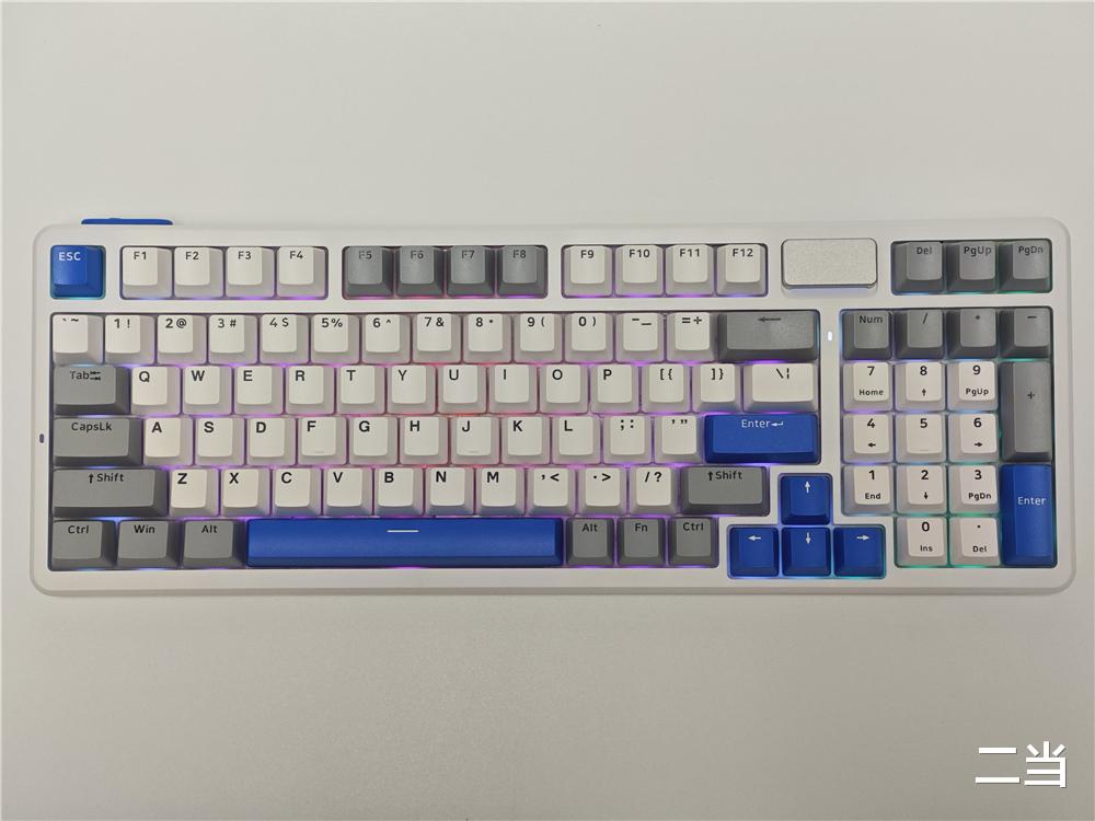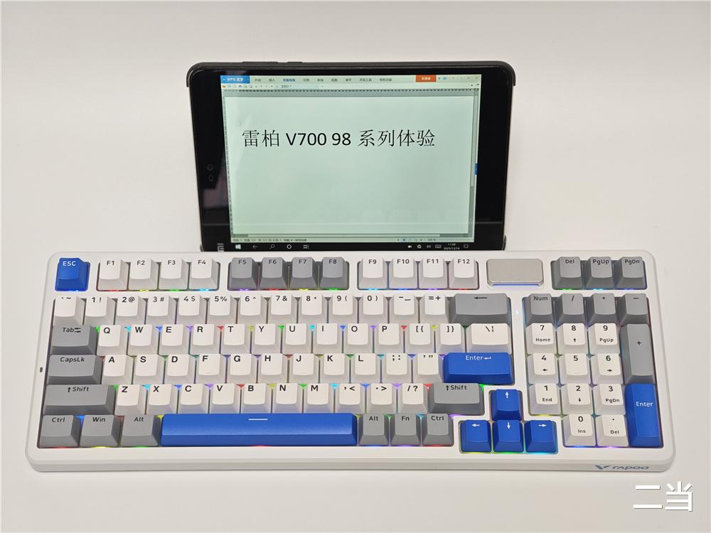 雷柏V700DIY-98长续航版提供幻影机甲、初号骑士、莫奈仙踪三种时尚配色,本次体验的“幻影机甲”白灰蓝配色为核心,无论是职场办公还是游戏桌面都不违和。键盘采用98配列布局,在保留数字小键盘的同时大幅缩减了机身尺寸,尺寸为388*143*42mm,其紧凑设计能释放更多桌面空间。