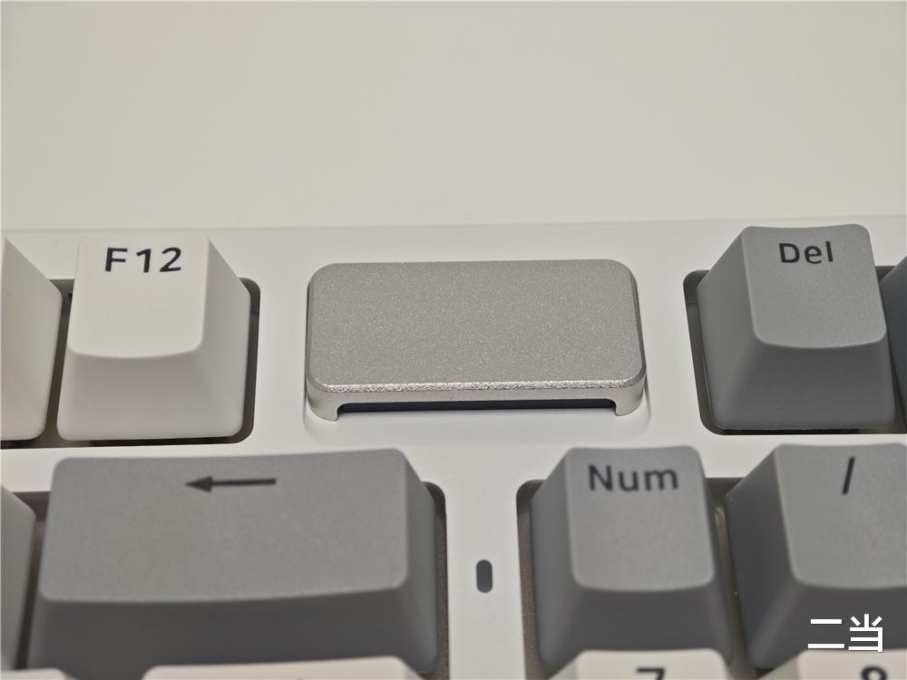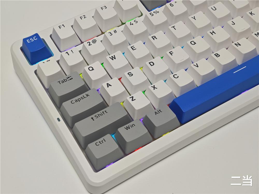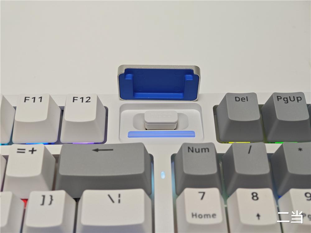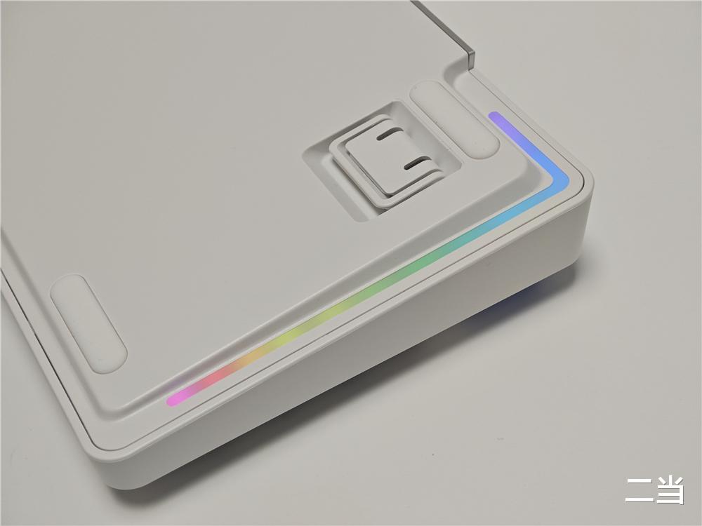 键盘右上角时空幻境仓,既是接收器的磁吸收纳区,又集成了电量指示与RGB装饰灯功能,用户可以灯带颜色变化判断键盘剩余电量,通过驱动还能自定义颜色和亮度,将实用性与美学完美融合。