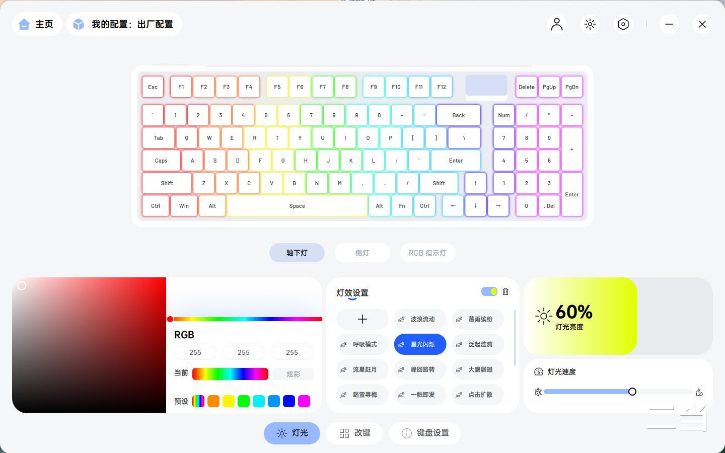键盘支持幻彩RGB按键背光,包含19种背光模式与8组驱动自定义背光模式,主键区、侧灯带与时空幻境仓灯条可独立调节。氛围侧灯带预设3种背光模式,按键亮度预设6档亮度调节,按键灯效预设6档速度调节。