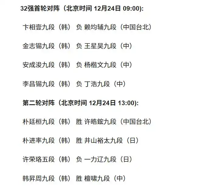 12月24日围棋赛事,昨天最为让棋迷关注的便是韩国棋院主办的首届世界围棋棋仙战32强的激战,因为中国队在32强首日的大战中4胜2负韩名将让中国棋手再次引来棋迷欢呼!尤其是32强首组的激战中,中国队4:0零封韩名将!