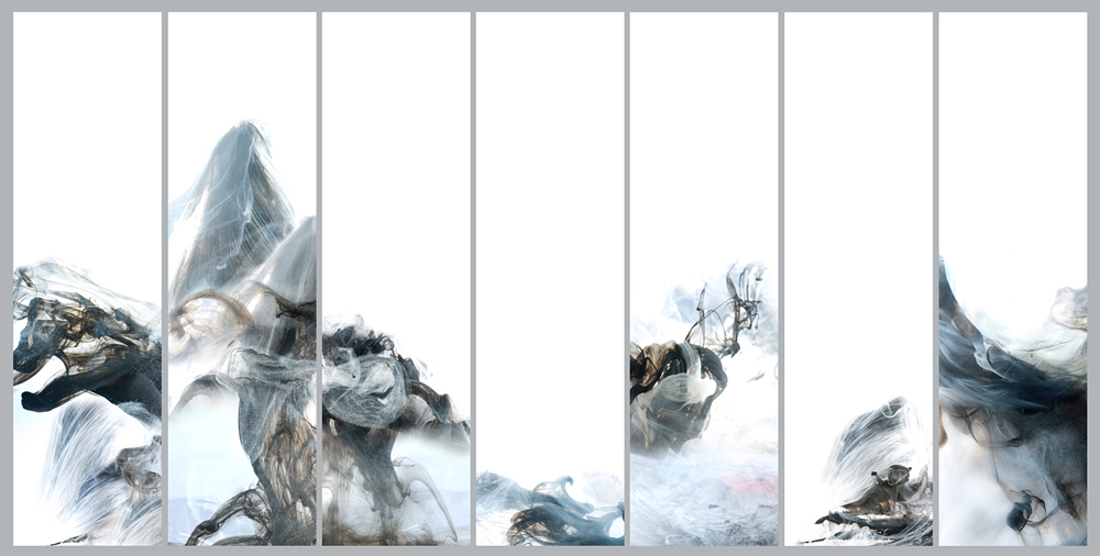 更有意味的是创作中的“让权”, 艺术家在此践行了一种“数字禅修”。艺术家主动放弃了笔对墨的控制,将生成的权利交还给水、墨与时间的自然博弈,艺术家成为联接自然之道的通道。摄影机只作静默的观者,数字后期则如禅修中的“观照”——在万千偶然墨象中,识别、驻足、重组。这过程本身,便是对“应无所住而生其心”的践行。技术不再是冰冷的工具,而成为延伸觉知的“慧眼”,在像素的海洋里打捞心性的痕迹。