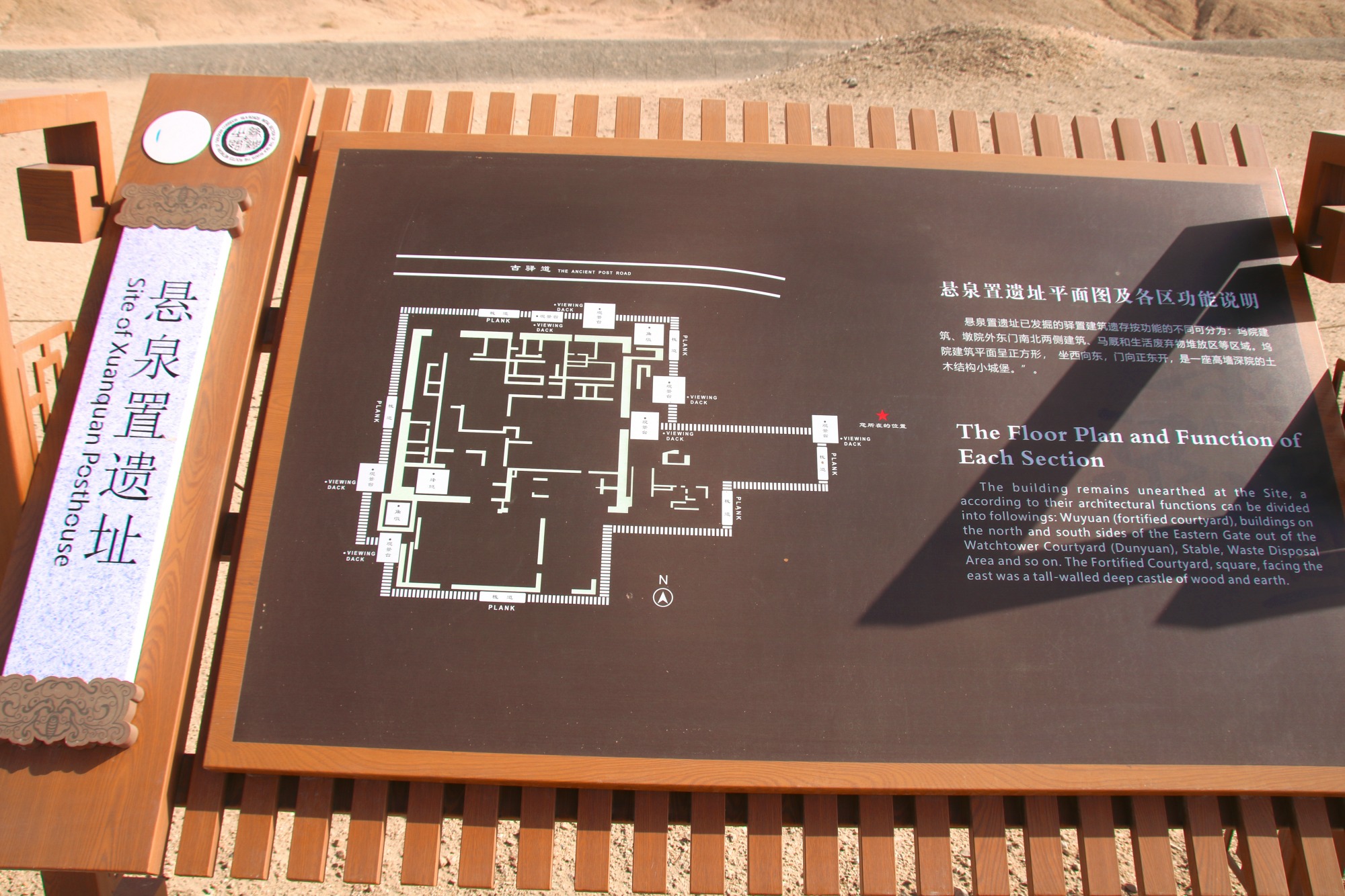 悬泉置的名字取自驿站东南侧山沟里被称为“吊吊水”的山泉,如今的遗址就是由悬泉置本身和悬泉水两部分构成。遗址中修建有博物馆,土黄色房屋低矮平整,既有汉朝建筑的风格又带着西北沙漠建筑的特色。