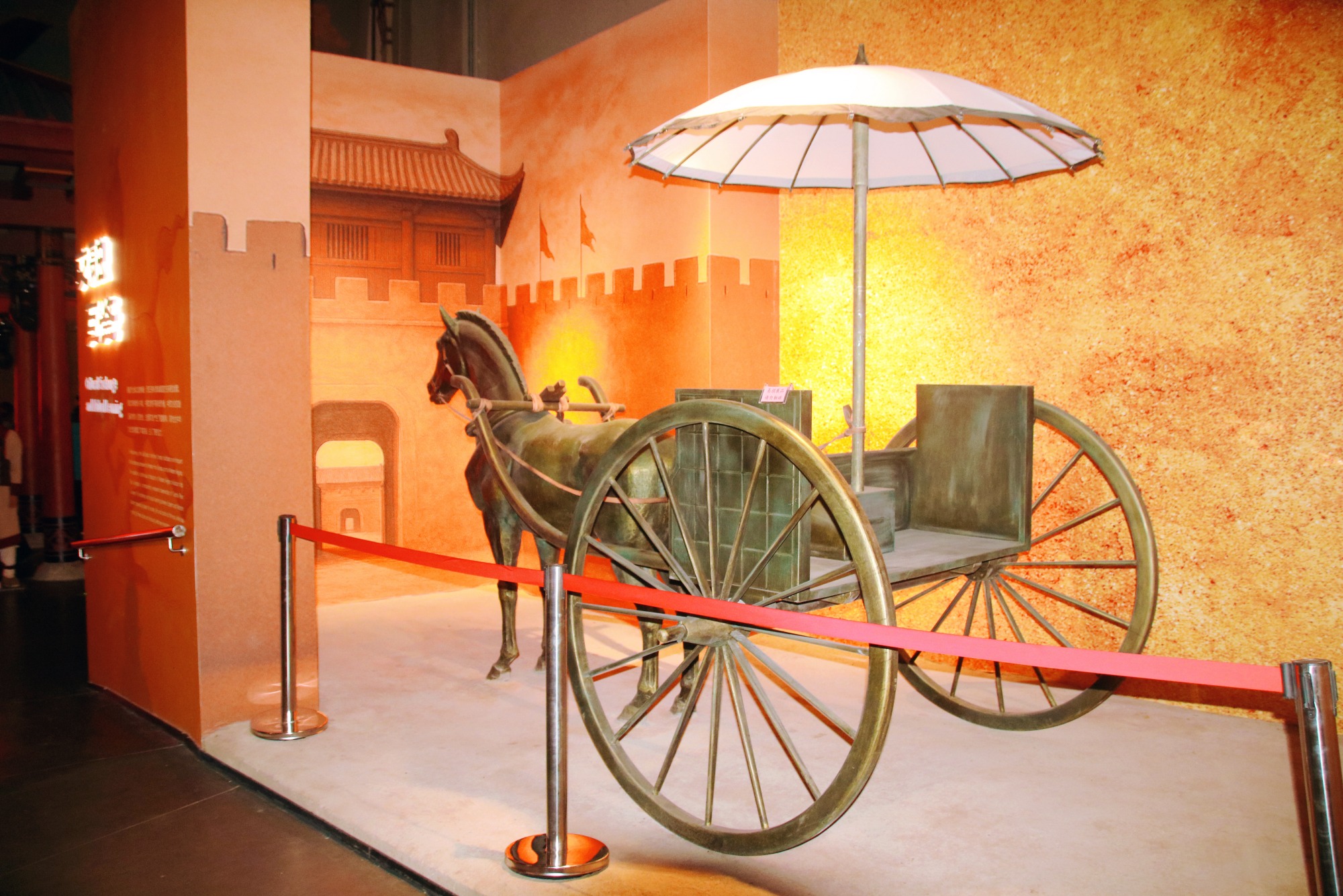 复原的青铜色的邮车是汉代信使奔波往来的交通工具,站在邮车前,仿佛能看到黝黑健壮的驿卒驾车在古丝绸之路上奔波,传递着西汉王朝的指令和西域各国的消息。