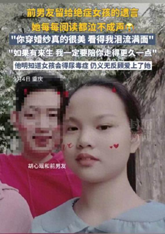 两人相识于2024年。彼时,胡心瑶正与8年血管炎(已恶化至肾衰竭晚期)缠斗,数十次病危通知书垒成她的日常;肖先生是从内蒙古来渝的辅警,明知她病重,仍坚定靠近。他两次求婚,她两次拒绝:“我活不长,不能拖累你。”