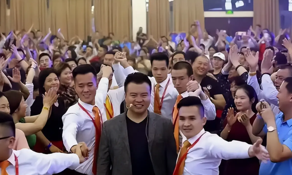 会场里的设计也是一环扣一环。震耳的音乐、闪烁的灯光、200多个托儿在关键时刻冲上台刷卡。杨涛鸣在台上声嘶力竭地喊:"今天报名高级课的,我亲自带你们去见百亿老板!"