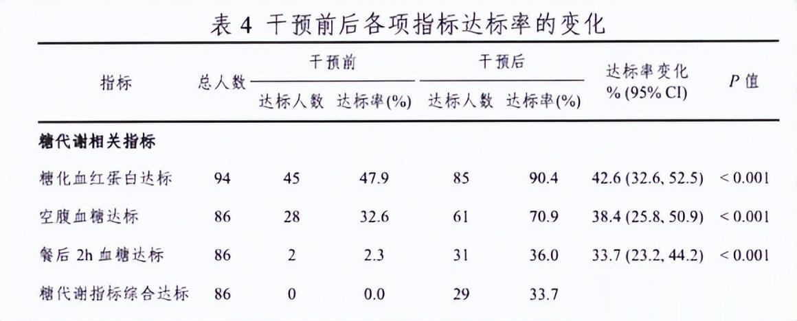 达标率大幅攀升:糖化血红蛋白达标率从 47.9% 升至 90.4%(翻近 1 倍),空腹血糖达标率从 32.6% 升至 70.9%(超 2 倍),餐后 2h 血糖达标率从 2.3% 飙升至 36.0%(超 15 倍),糖代谢指标综合达标率从 0 突破至 33.7%;