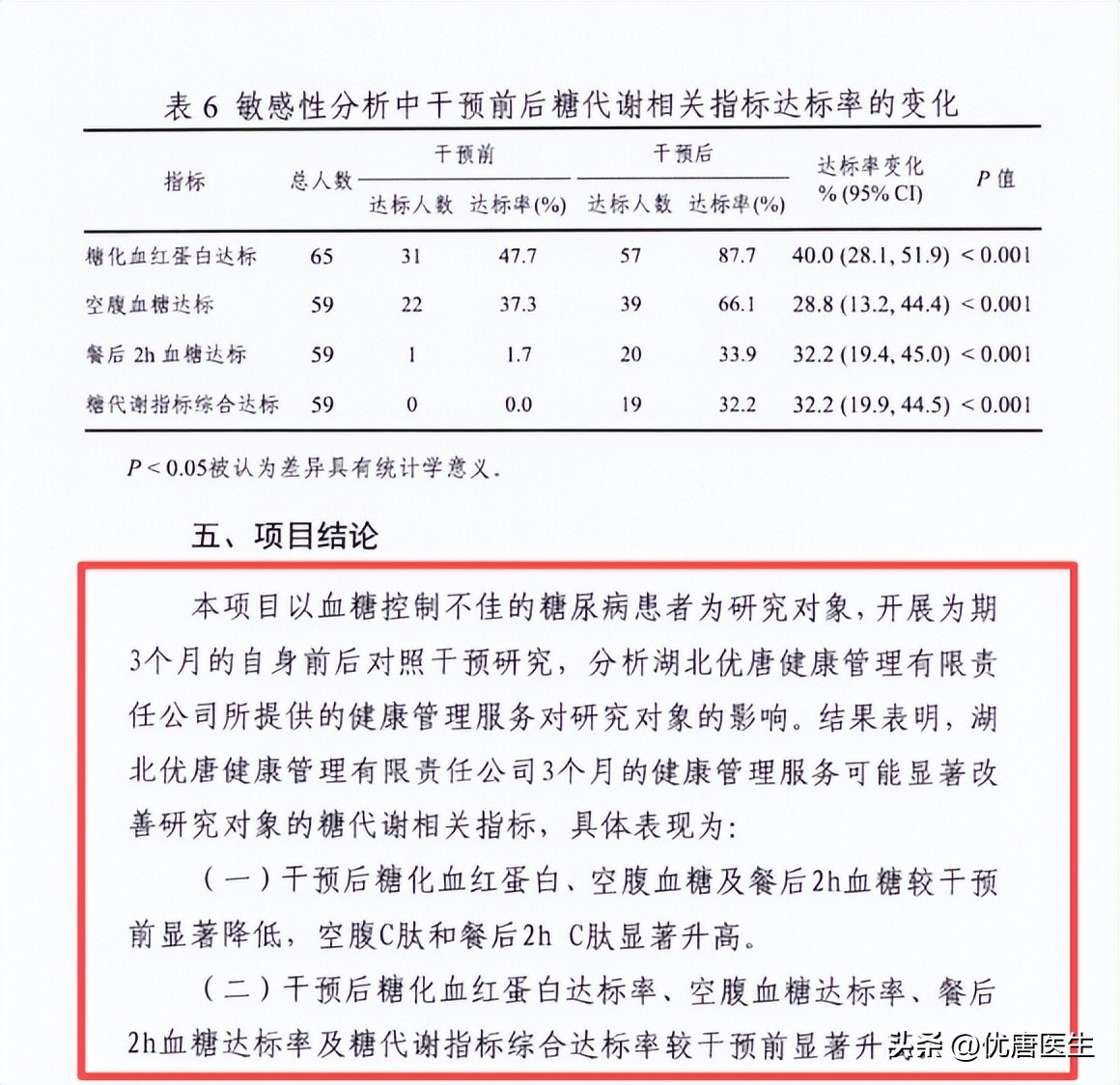 研究验证了优唐 “糖无忧” 管理服务的系统性与正确性:通过3个月的健康管理服务能对血糖控制不佳的2型糖尿病患者产生积极影响—— 不仅改善糖代谢,还能优化身体成分、控制血压、保护肝肾功能、缓解并发症症状,且排除加药影响后效果仍稳定,说明服务体系 “不依赖药物,更靠科学干预”。