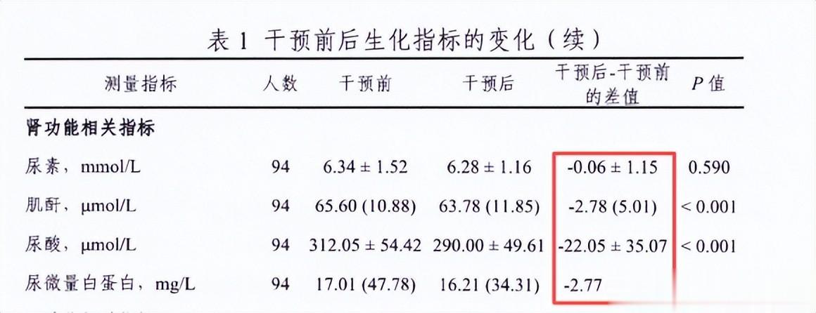 血脂 + 肝肾功能优化:总胆固醇降低 0.27mmol/L,甘油三酯降低 0.07mmol/L,低密度脂蛋白(“坏胆固醇”)降低 0.20mmol/L,心脑血管疾病风险下降;肾功能指标更亮眼:血肌酐降低 2.78umol/L,尿酸降低 22.05umol/L,尿微量白蛋白降低 2.77mg/L,肝肾保护效果显著;