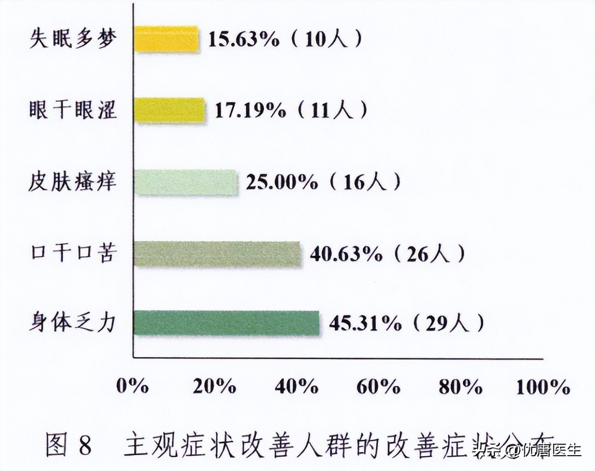 主观症状改善率超 9 成:70 名有乏力、口干、皮肤瘙痒等症状的患者中,91.43% 反馈症状减轻,其中 “身体乏力”“口干口苦” 改善最明显,失眠多梦、眼干眼涩等问题也大幅缓解;
