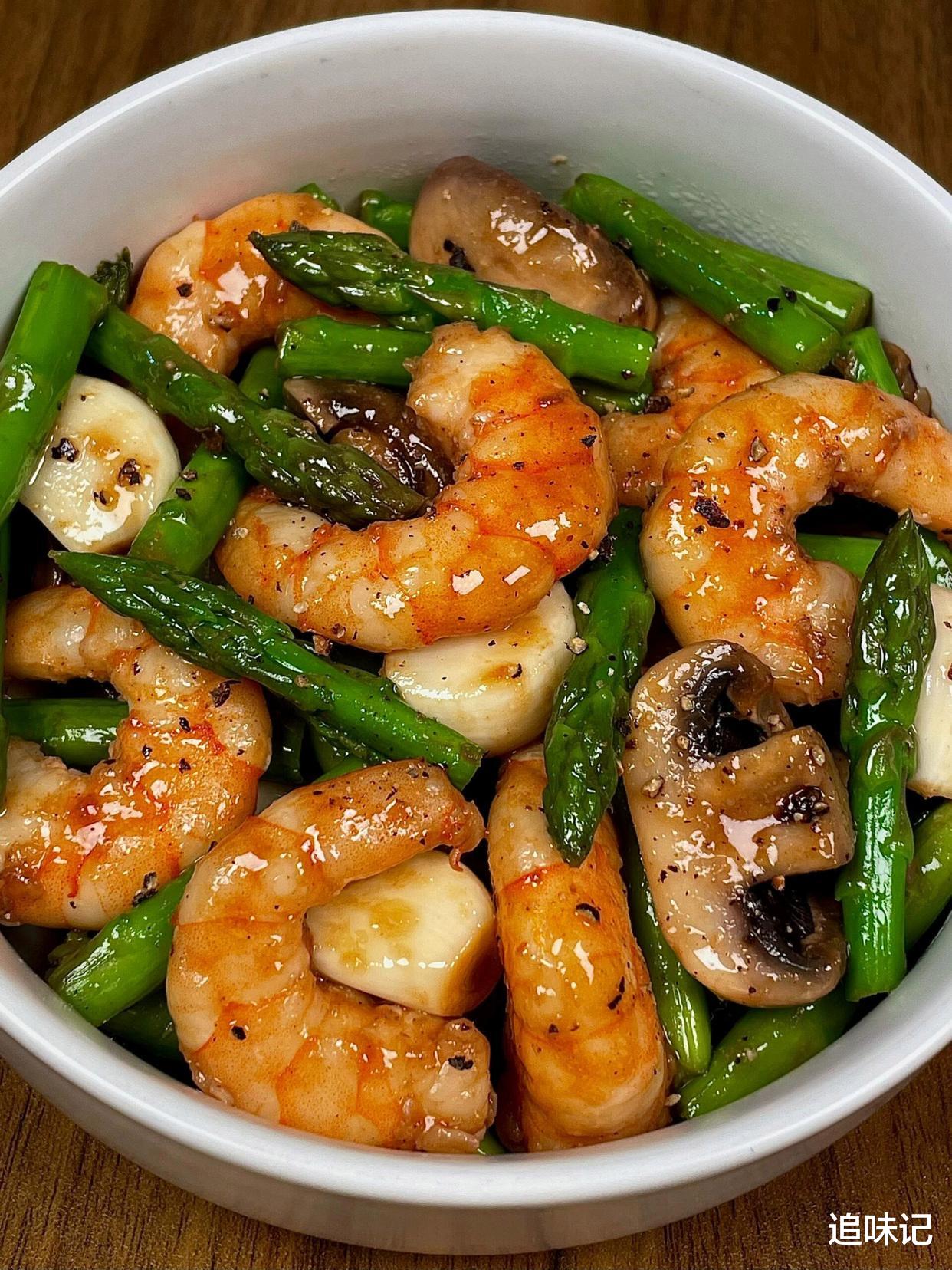 芦笋虾仁炒口蘑虾仁鲜嫩弹牙,芦笋清脆可口,口蘑的鲜美和蒜香完美融合,蚝油和黑胡椒的调味让整道菜更有层次。
