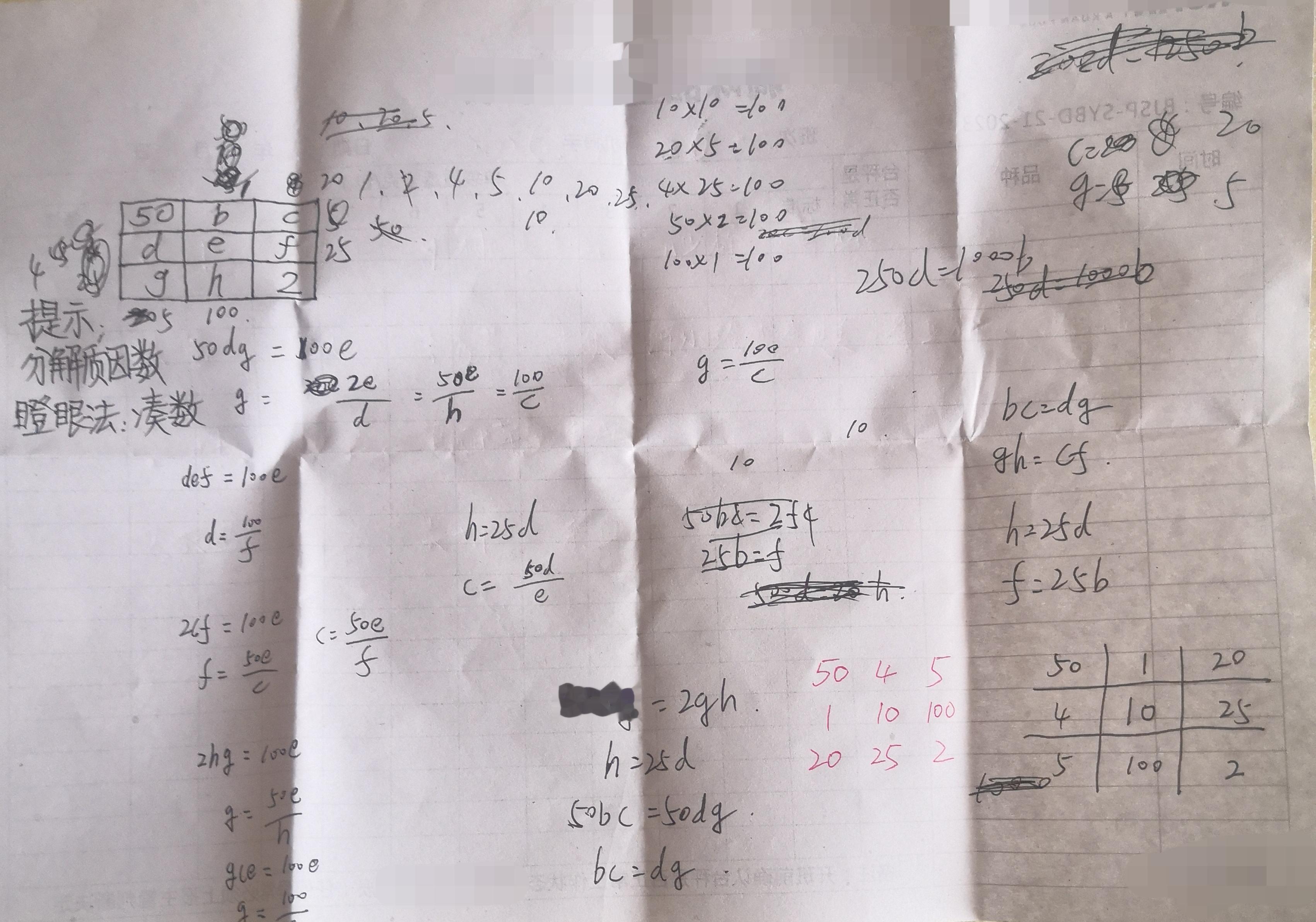 每个字母表示一个不为零的自然数,三横三纵两条对角线的乘积等于一个常数,求左下角的数。